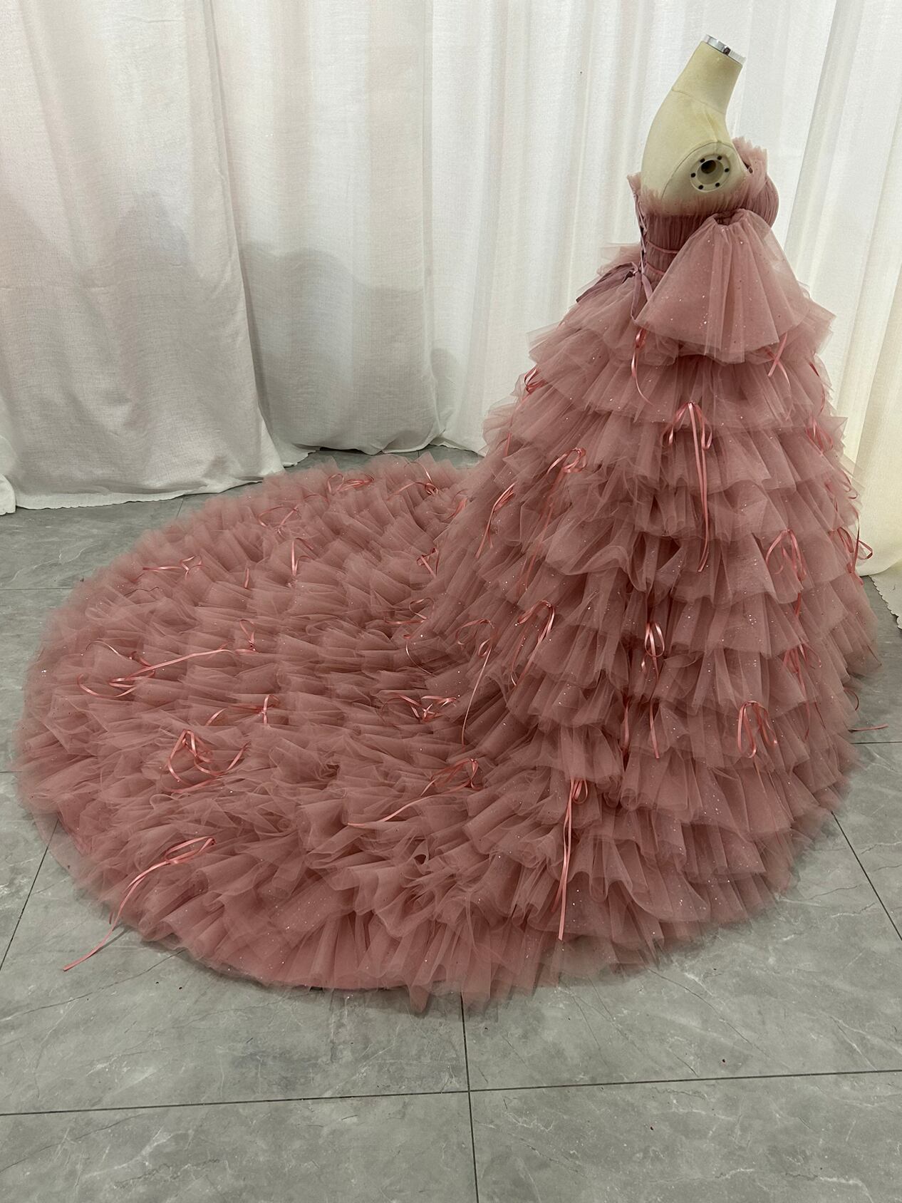 送料無料!カラードレス フリル袖 シークインチュール ボリュームドレス 柔らかく重ねたチュールスカート 華やかなトレーン 結婚式