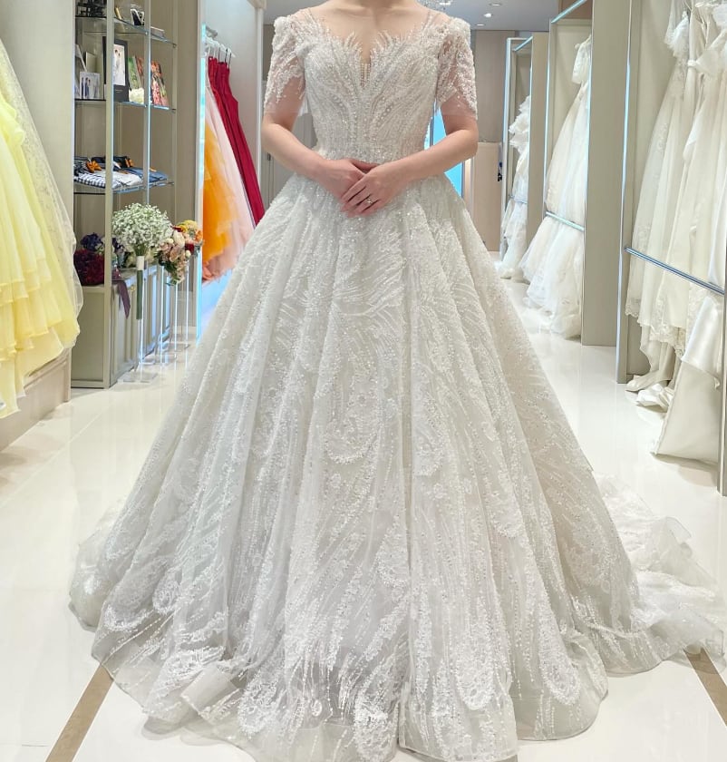 ウエディングドレス オフホワイト 韓国風ドレス 短袖 シークインチュール 編み上げ 華やかなトレーン 憧れのドレス 結婚式
