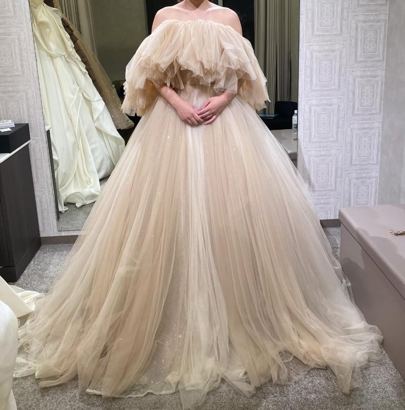カラードレス あんず色 取り外し可能なオフショルダー キラキラグリッターチュール ソフトチュール 華やかなトレーン 花嫁 前撮り