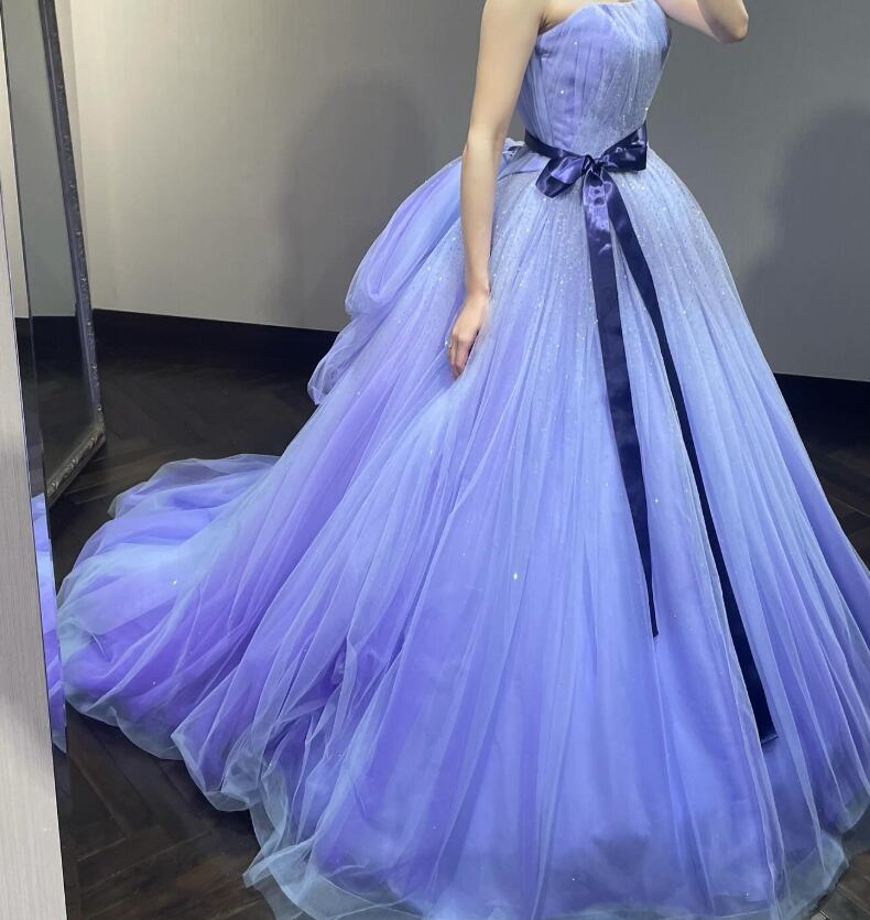 カラードレス ブルー サッシュベルト ふっくら柔らかなバックリボン キラキラグリッターチュール 編み上げ 華やかなトレーン ビスチェドレス 結婚式 前撮り