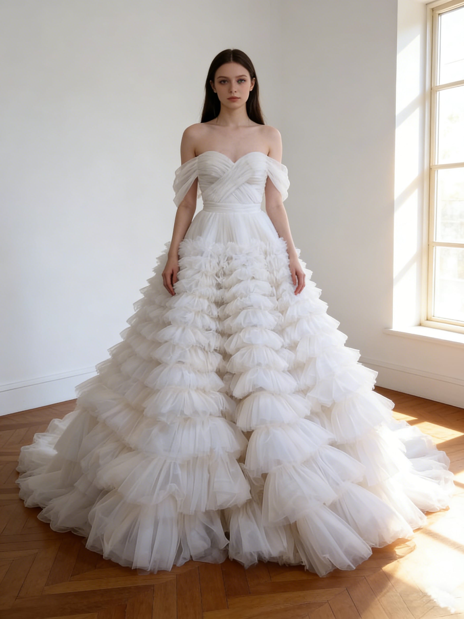 ウエディングドレス オフホワイト オフショルダー 柔らかく重ねたチュールスカート 華やかなトレーン ブライダル