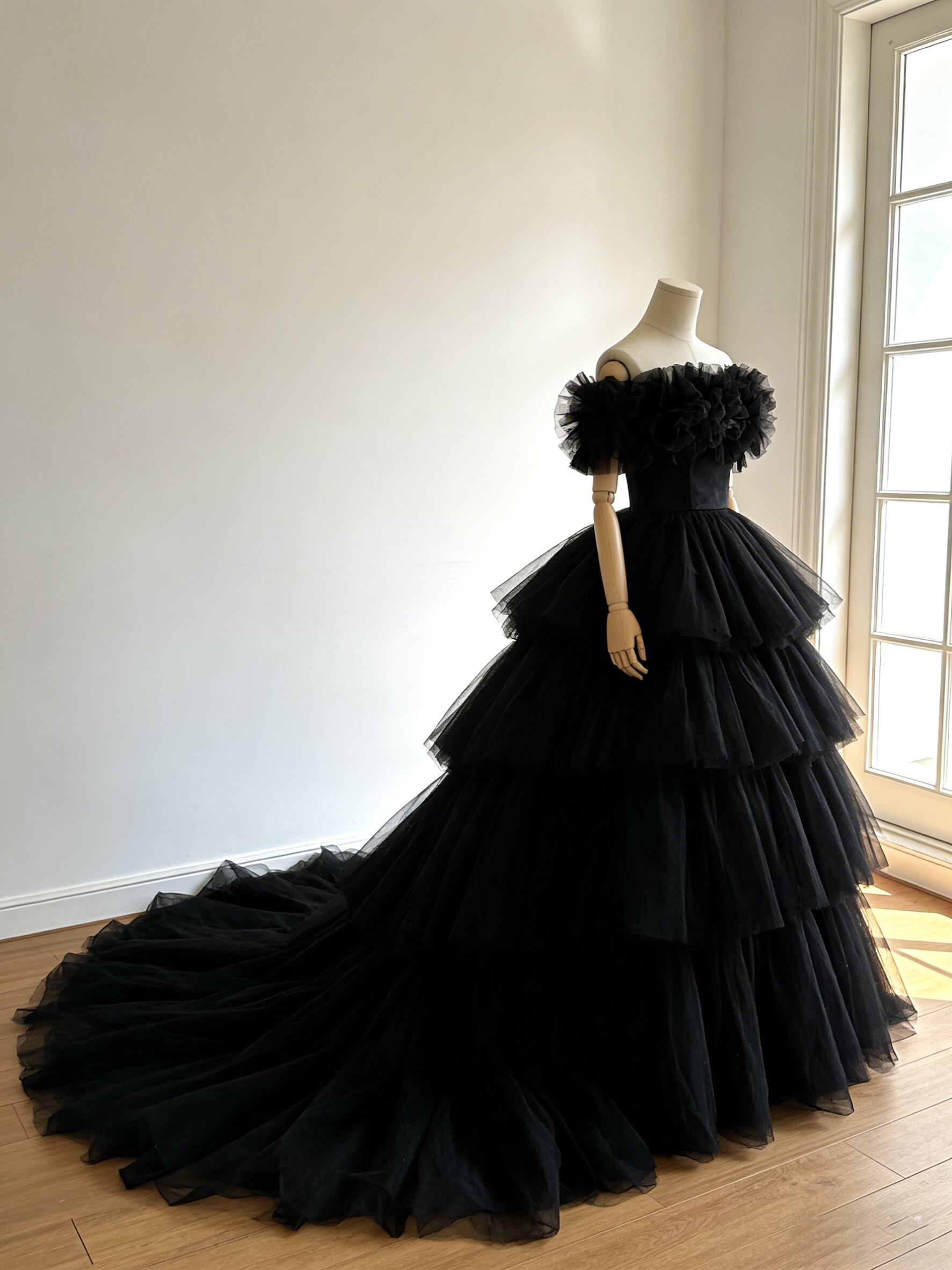 カラードレス ブラック オフショルダー 柔らかく重ねたチュールスカート スリット 華やかなトレーン 結婚式