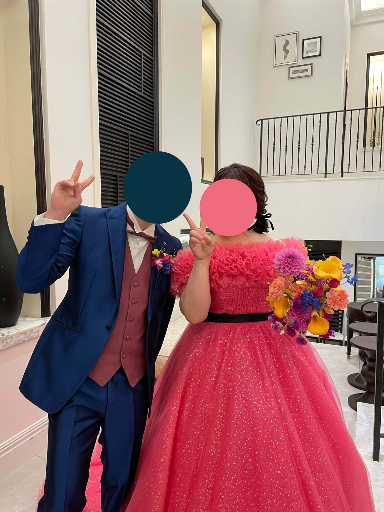 実例写真!カラードレス ピンク オフショルダー ソフトチュール 華やかなトレーン 花嫁 前撮り
