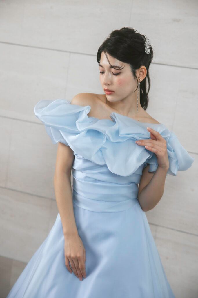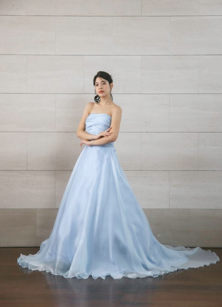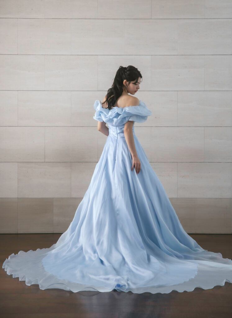 カラードレス 爽やかで優しいブルー 取り外し可能なオフショルダー 上質オーガンジー 華やかなトレーン 結婚式