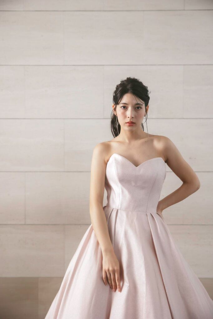 カラードレス ピンク ビスチェドレス 光沢サテン 華やかなトレーン 色直し 花嫁