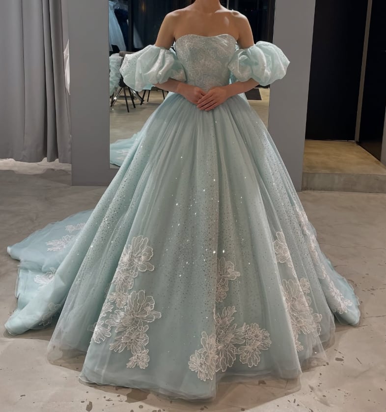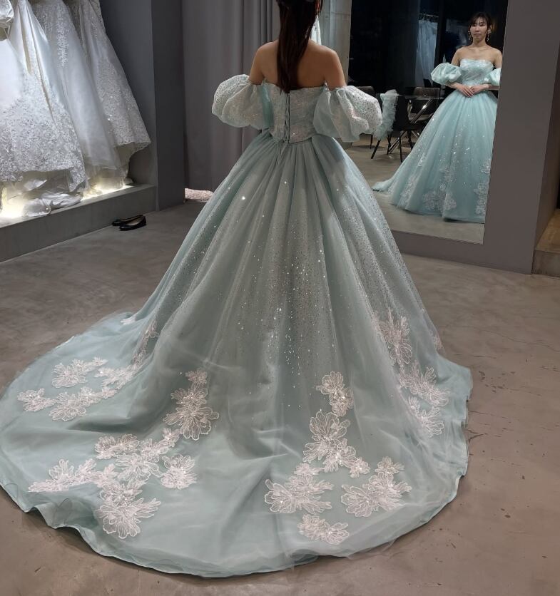 カラードレス 水色 取り外し可能な付け袖 キラキラグリッターチュール 花柄モチーフで刺繍が美しい 編み上げ 華やかなトレーン 結婚式