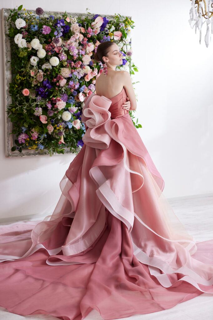 カラードレス ピンク 立体ドレープ 光沢サテン 上質オーガンジー 華やかなトレーン ビスチェドレス 結婚式