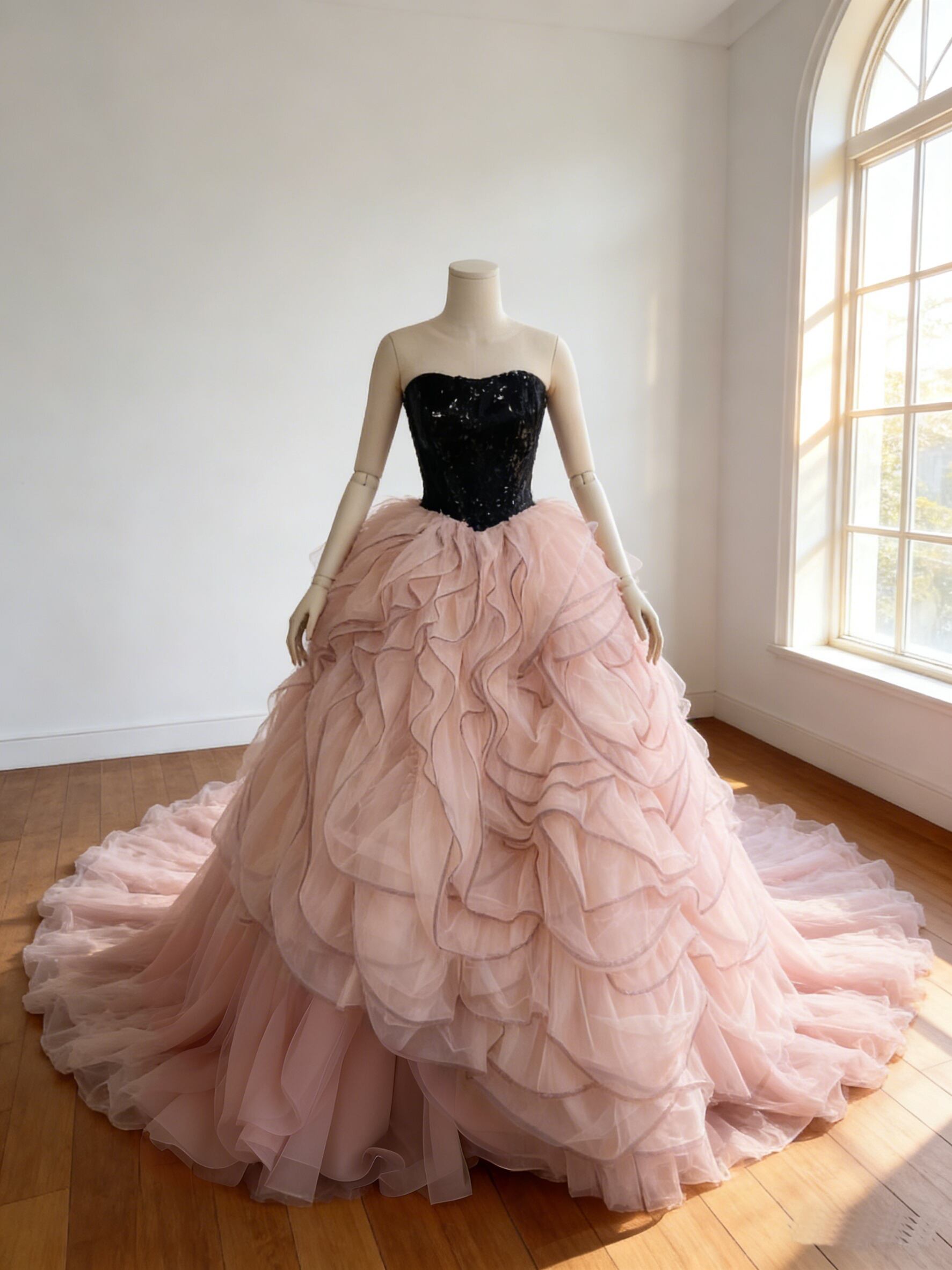 カラードレス ピンク アシンメトリードレス ビスチェドレス 華やかなトレーン ブライダル 色直し