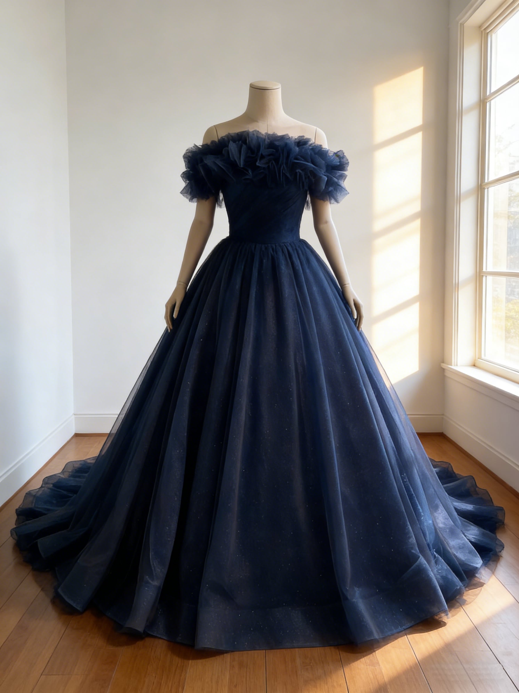 カラードレス ネイビー オフショルダー ボリュームドレス 華やかなトレーン 結婚式