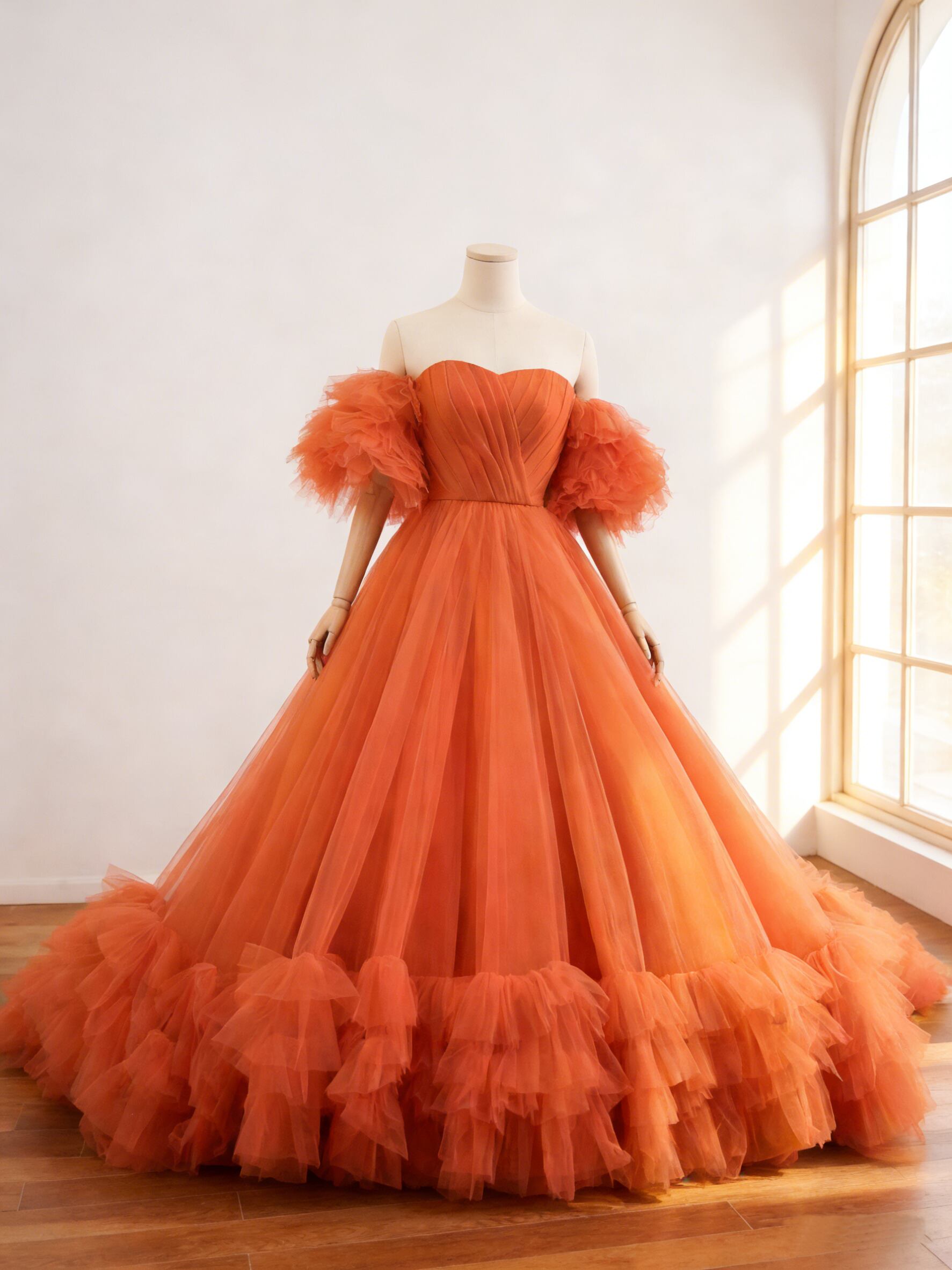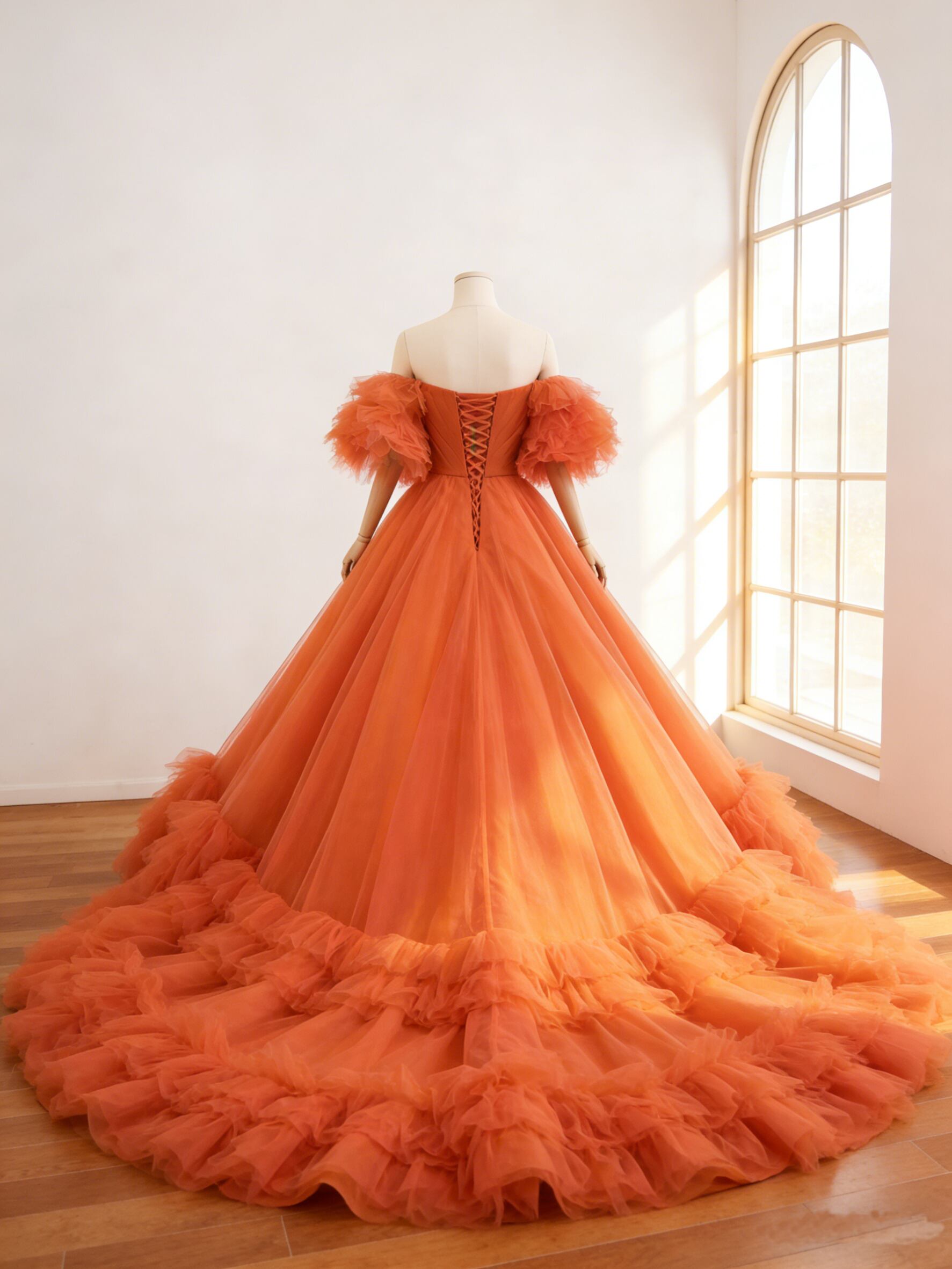 カラードレス オレンジ 取り外し可能な付け袖 ボリュームドレス ソフトチュール 華やかなトレーン 結婚式