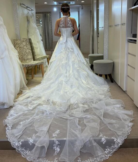ウエディングドレス オフホワイト ホルターネック 光沢サテン 繊細なレース 華やかなトレーン 結婚式