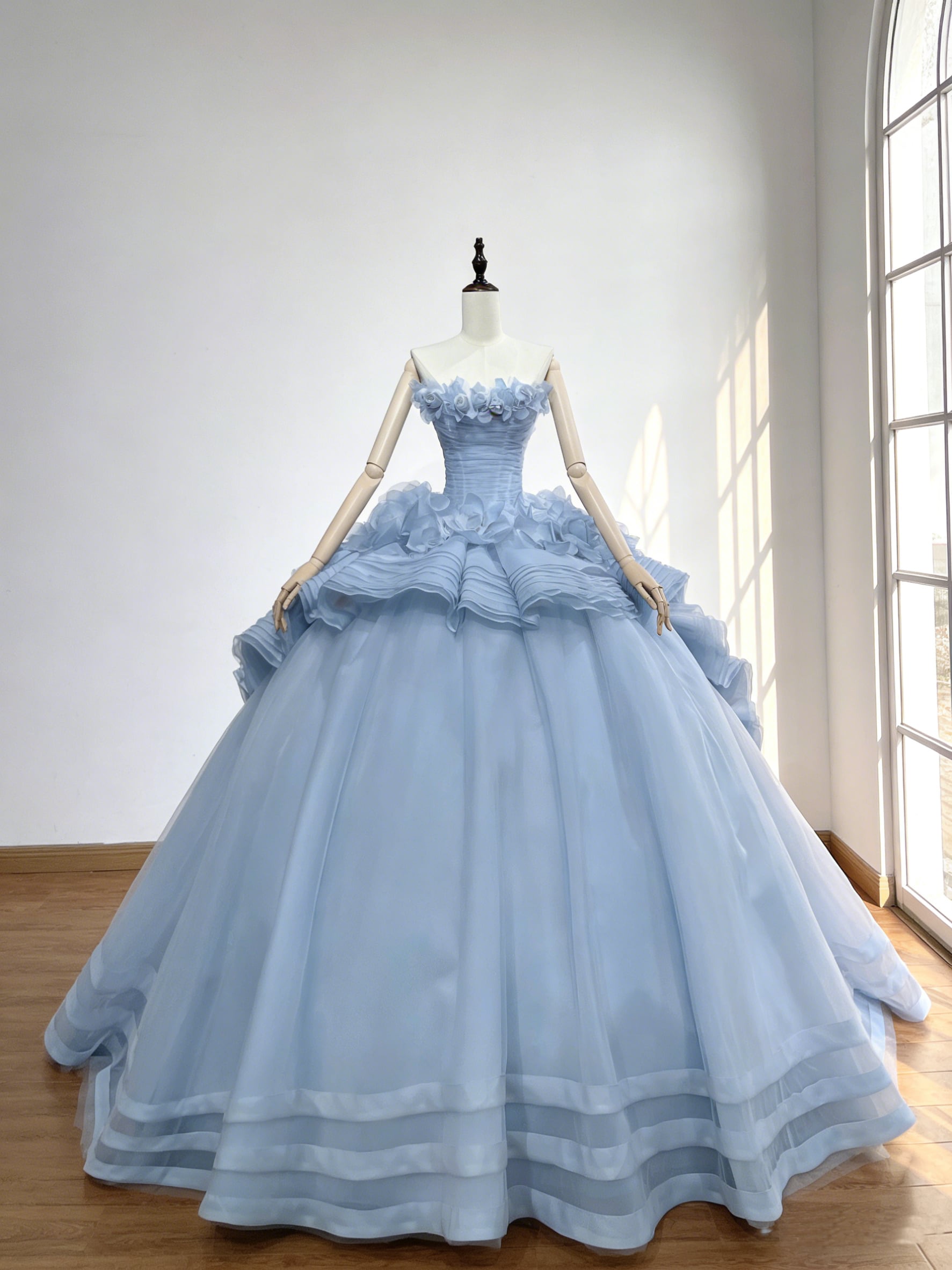 カラードレス 爽やかで優しいブルー 韓国風ドレス ビスチェドレス 華やかなトレーンふわふわドレス 結婚式