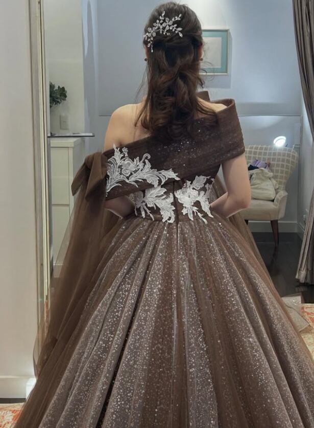 カラードレス ブラウン 取り外し可能なオフショルダー シークインチュール 裾に繊細レースをあしらった 華やかなトレーン 花嫁