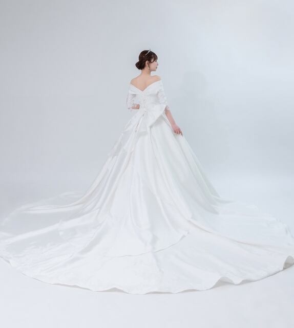 ウエディングドレス オフホワイト オフショルダー 取り外し可能な付け袖 繊細なレース 華やかなトレーン 光沢サテン アンティークなドレス ブライダル