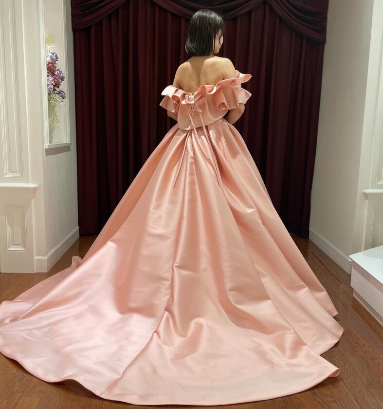 カラードレス ピンク オフショルダー 光沢サテン 華やかなトレーン 編み上げ プリンセスライン 花嫁 前撮り