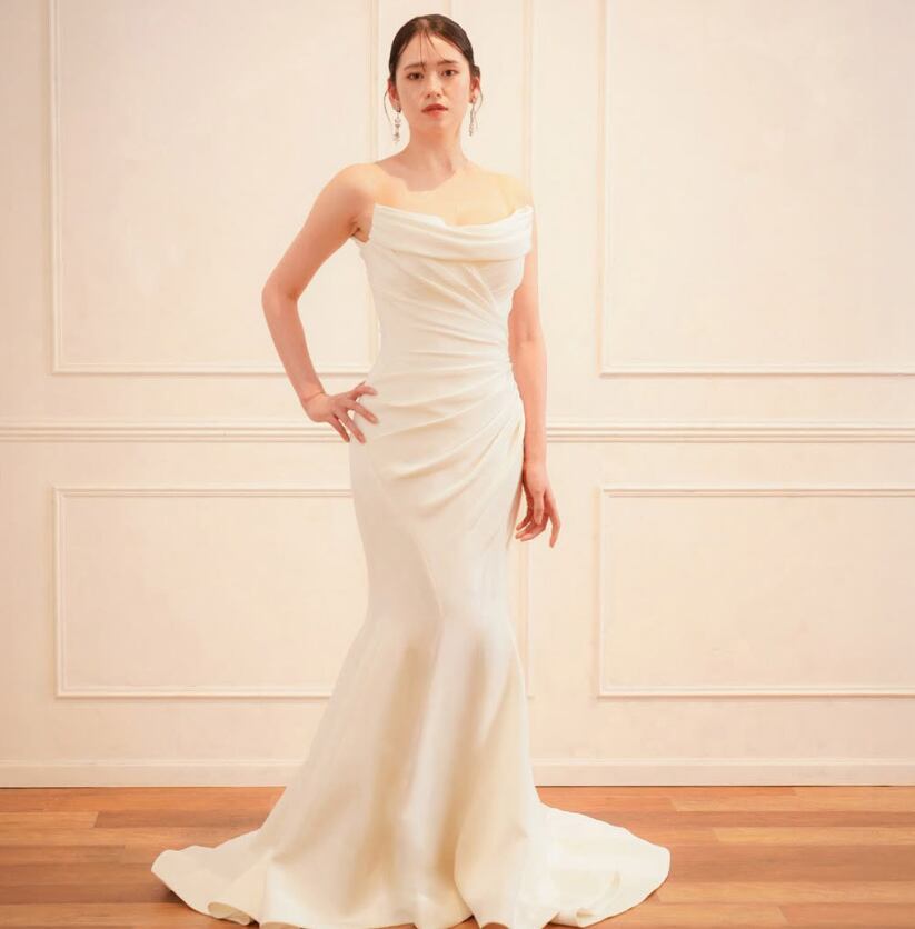 ウエディングドレス オフホワイト 取り外し可能な付け袖 ファスナー マーメイドライン 細見えシルエット ミニトレーン 結婚式 前撮り