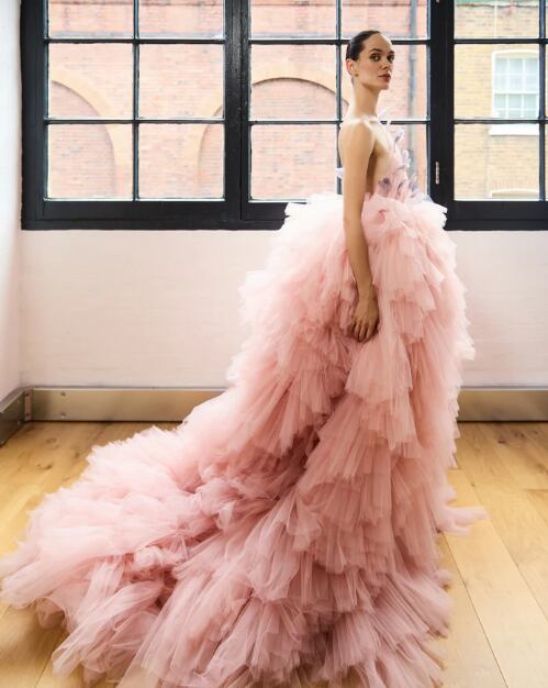 カラードレス ピンク ショルダー型 3D立体レース刺繍 肩出し バックレス ソフトチュール 華やかなトレーン 花嫁 前撮り