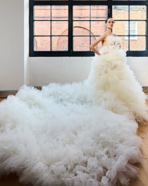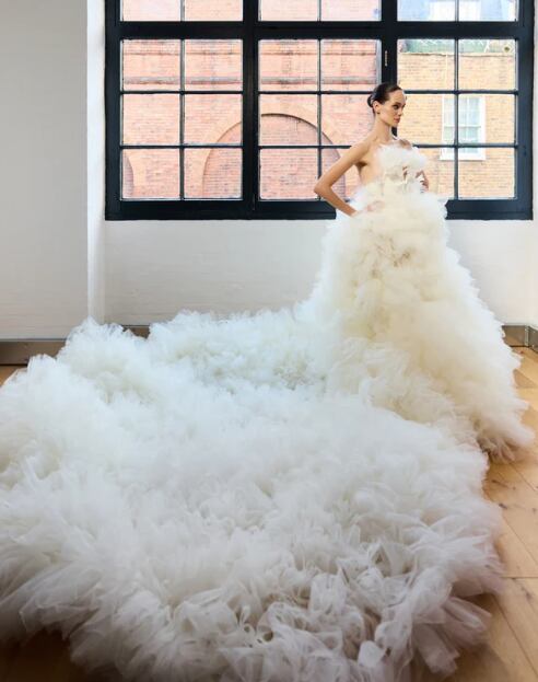 高品質!ウエディングドレス オフホワイト ベアトップ バックレス 柔らかく重ねたチュールスカート 大人っぽい 華やかなトレーン もこもこドレス 結婚式