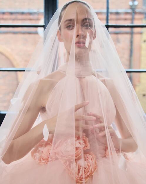 カラードレス ピンク ホルターネック アシンメトリードレス プリンセスライン バラトレーン ロングベール 華やかなトレーン 結婚式
