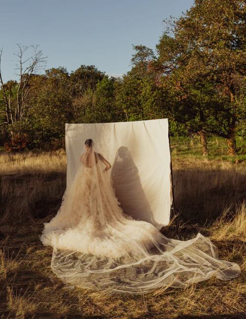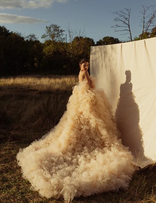 ウエディングドレス オフホワイト ベアトップ ロングベール 柔らかく重ねたチュールスカート もこもこドレス 華やかなトレーン 結婚式