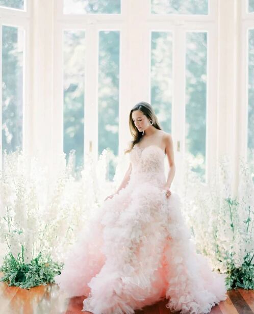 カラードレス 薄ピンク ベアトップ ロングベール 柔らかく重ねたチュールスカート もこもこドレス プリンセスライン 結婚式