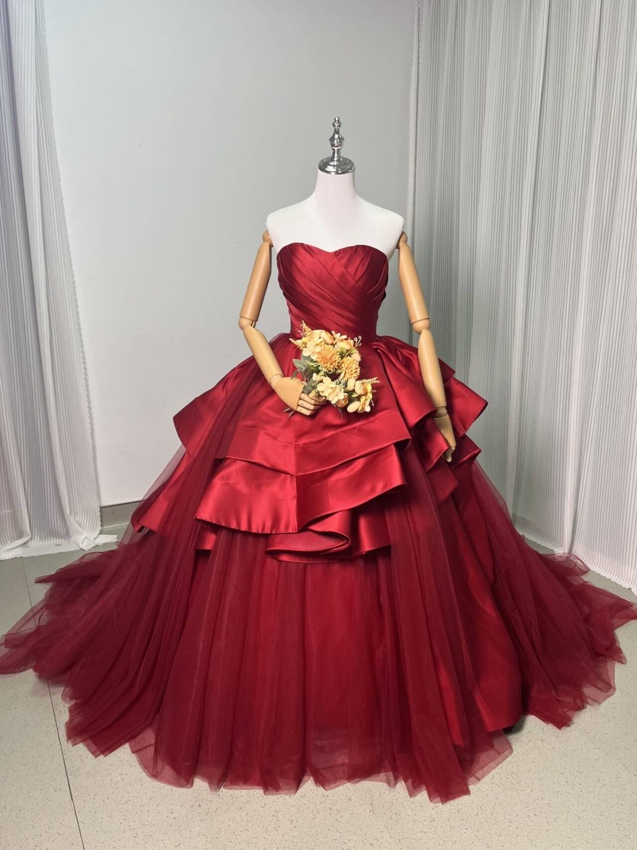 実例写真! カラードレス ボルドー色 ビスチェドレス 光沢サテン+ソフトチュール 編み上げ 華やかなトレーン 花嫁