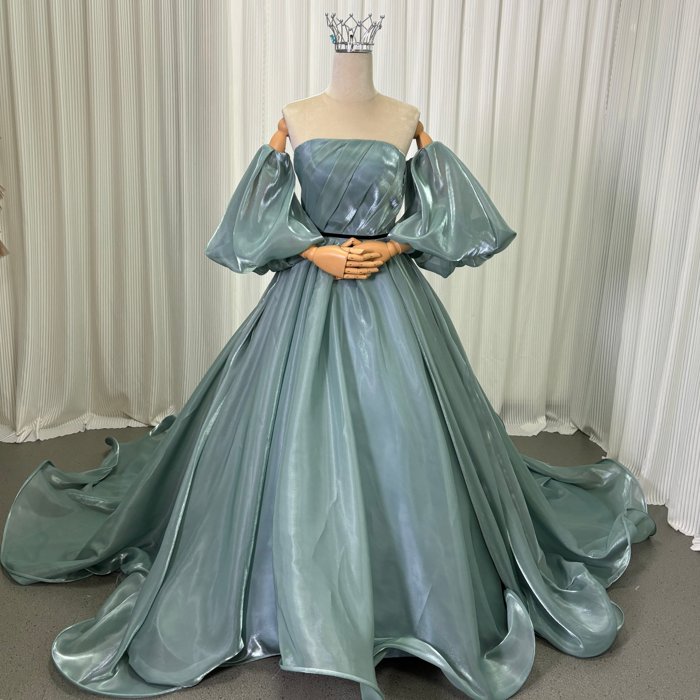 カラードレス グリーン 取り外し可能な付け袖 ウェーブ スリット 編み上げ 華やかなトレーン 結婚式