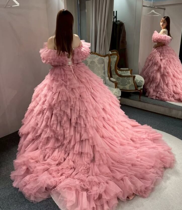 カラードレス ピンク ボリュームドレス オフショルダー プリンセスライン 華やかなトレーン 花嫁 前撮り