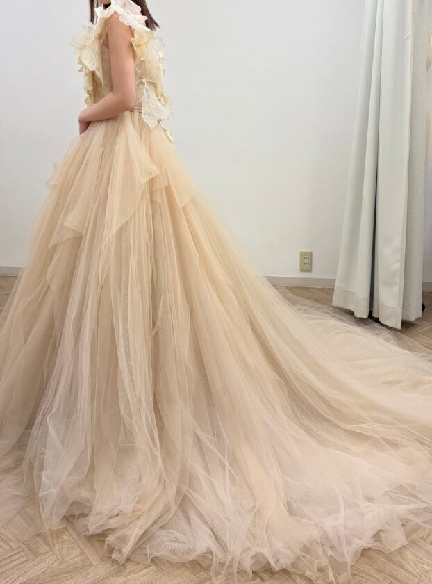 カラードレス 薄シャンパン色 ショルダー型 シークインチュール ロングトレーン 花嫁 前撮り