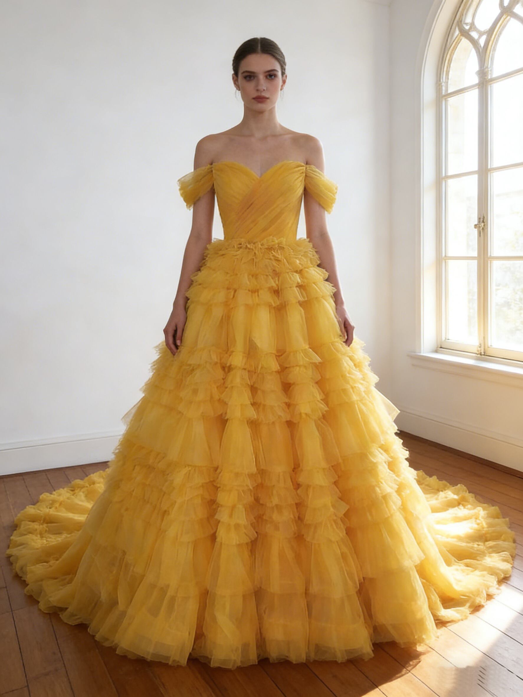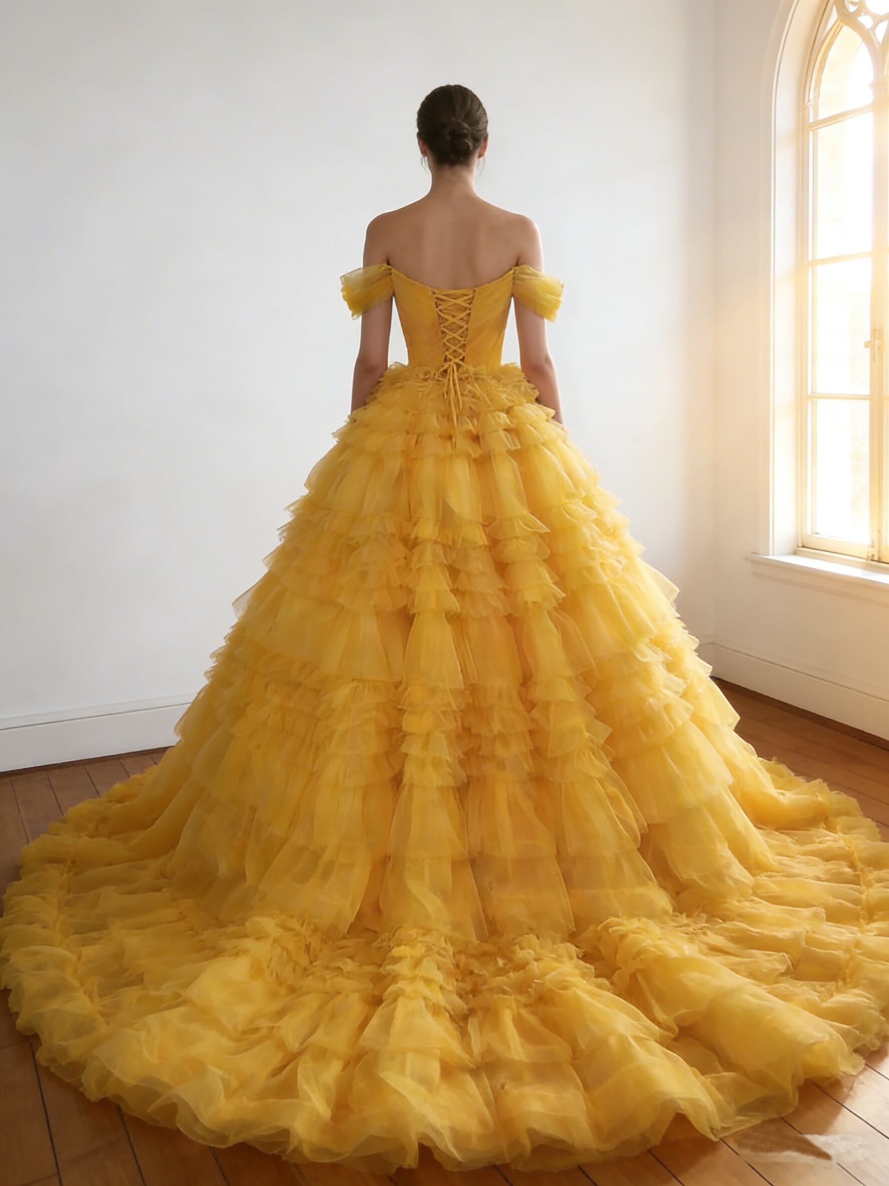 カラードレス 鬱金色 オフショルダー ロングトレーン 色直し 柔らかく重ねたチュールスカート 花嫁