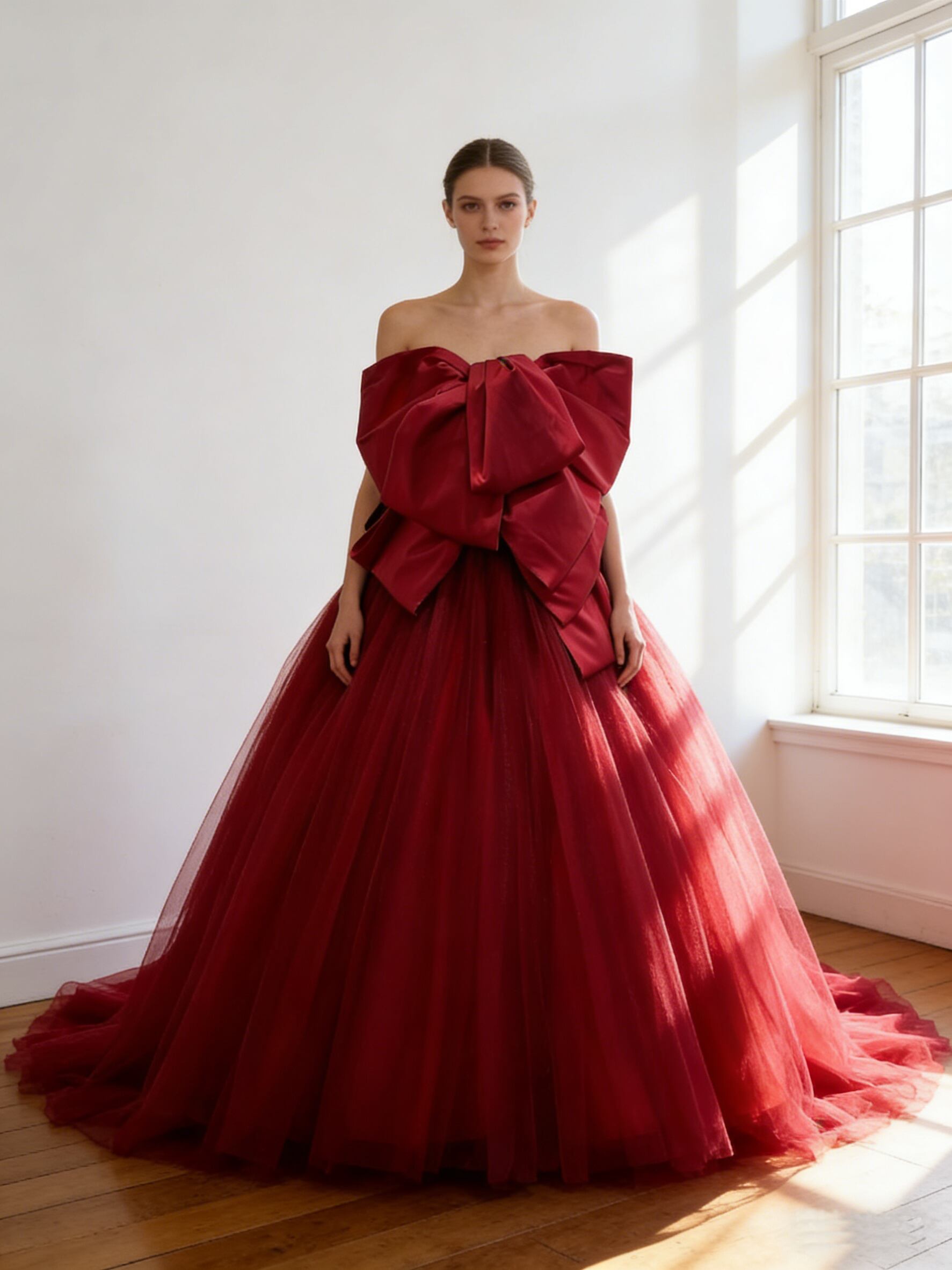 カラードレス ボルドー色 アシンメトリー風 ソフトチュール ふっくら柔らかなバックリボン トレーン 花嫁