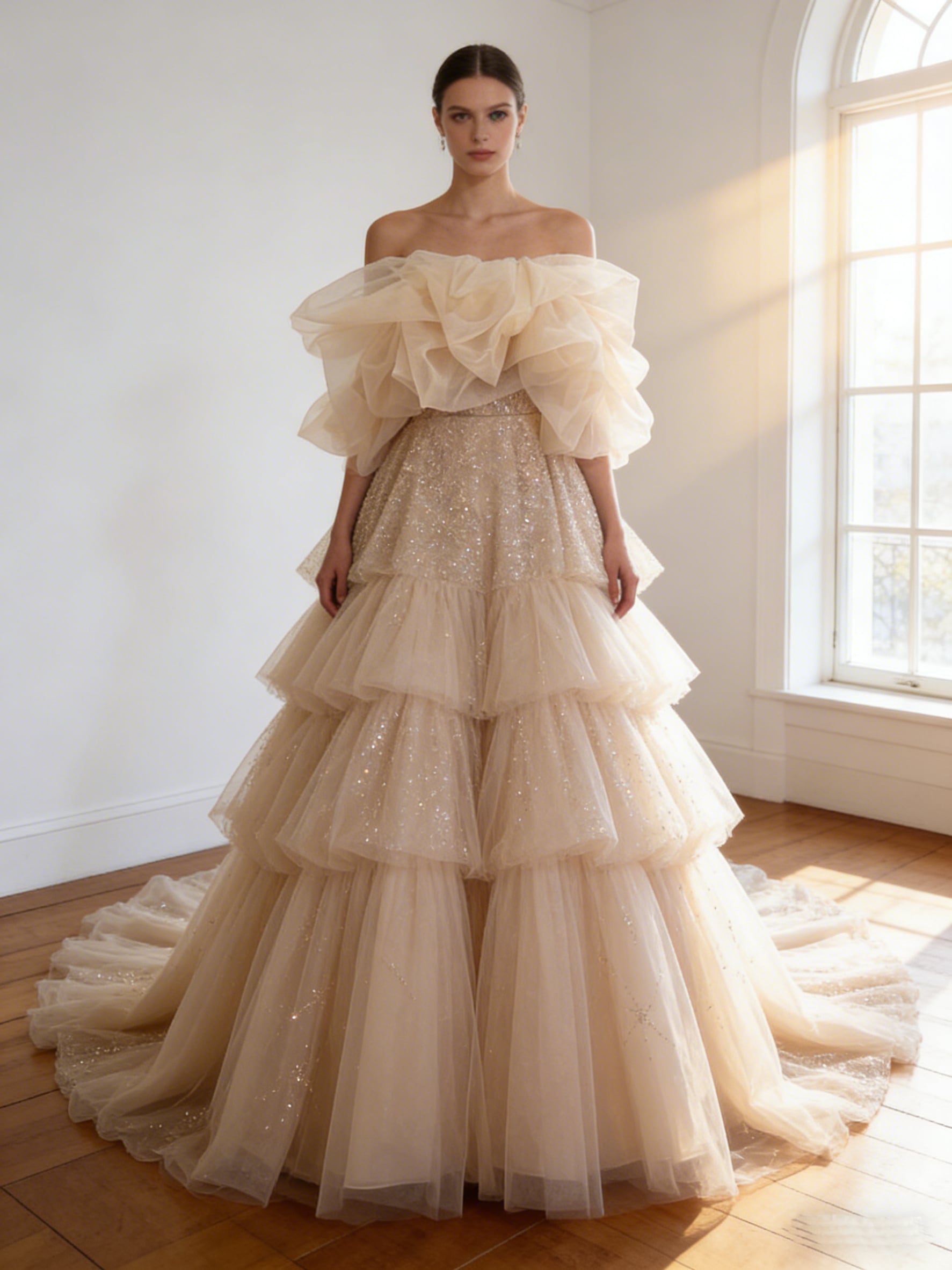 カラードレス シャンパン色 オフショルダー シークインチュール 華やかなトレーン 結婚式