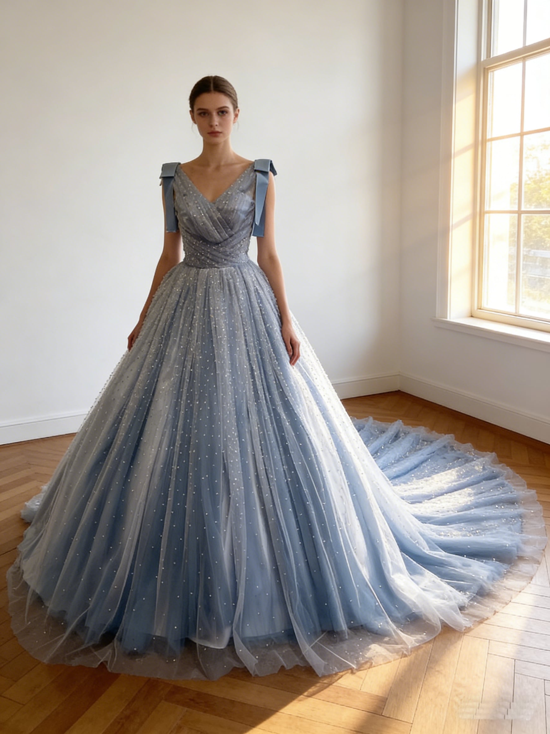 カラードレス ブルー キャミソール シークインチュール 華やかなトレーン グラデーションドレス 花嫁