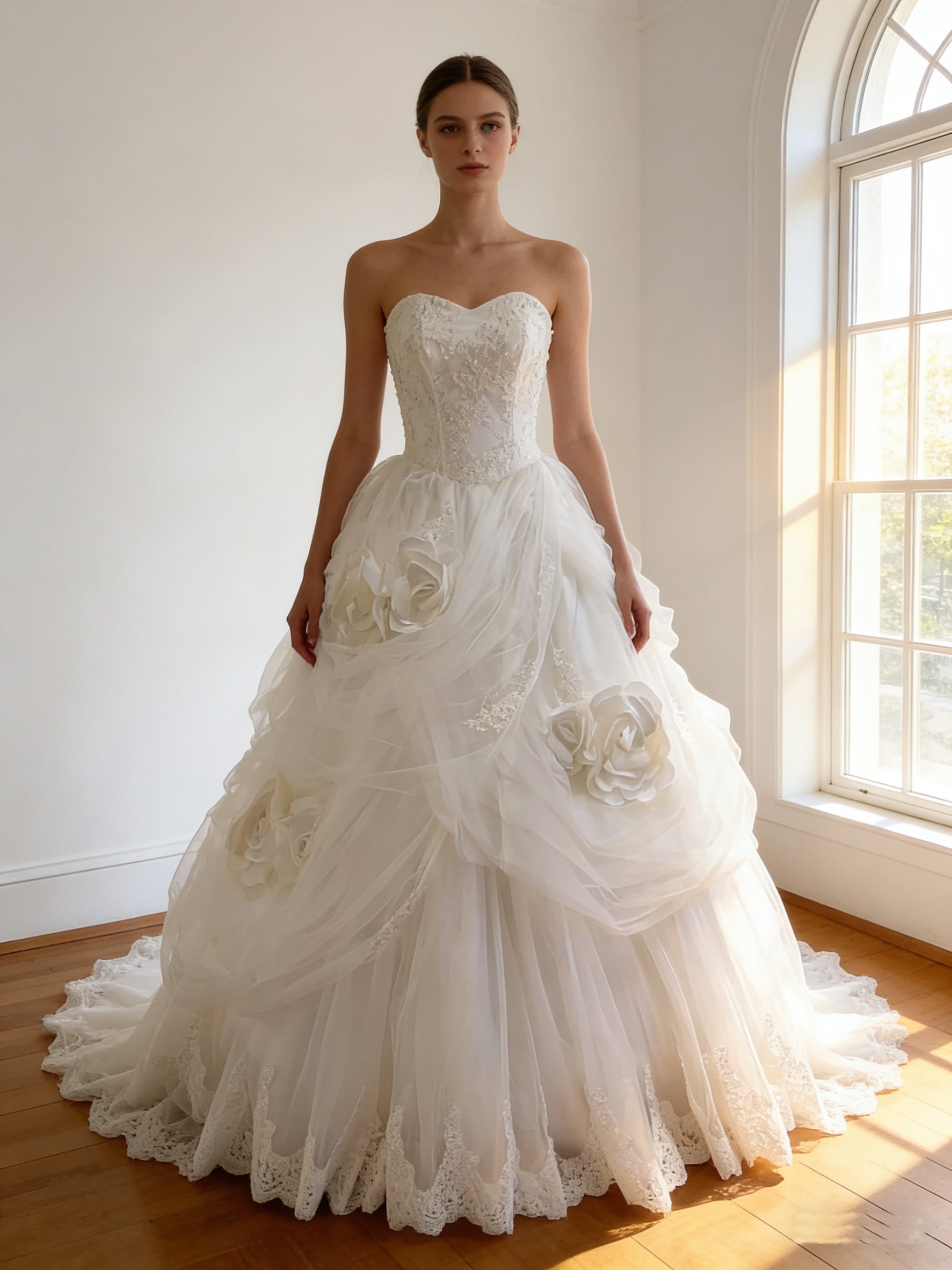 ウエディングドレス オフホワイト バラトレーン 華やかなトレーン ビスチェドレス ブライダル