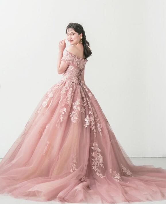 カラードレス ピンク 取り外し可能なオフショルダー 繊細なレース 華やかなトレーン 可愛い 結婚式 前撮り