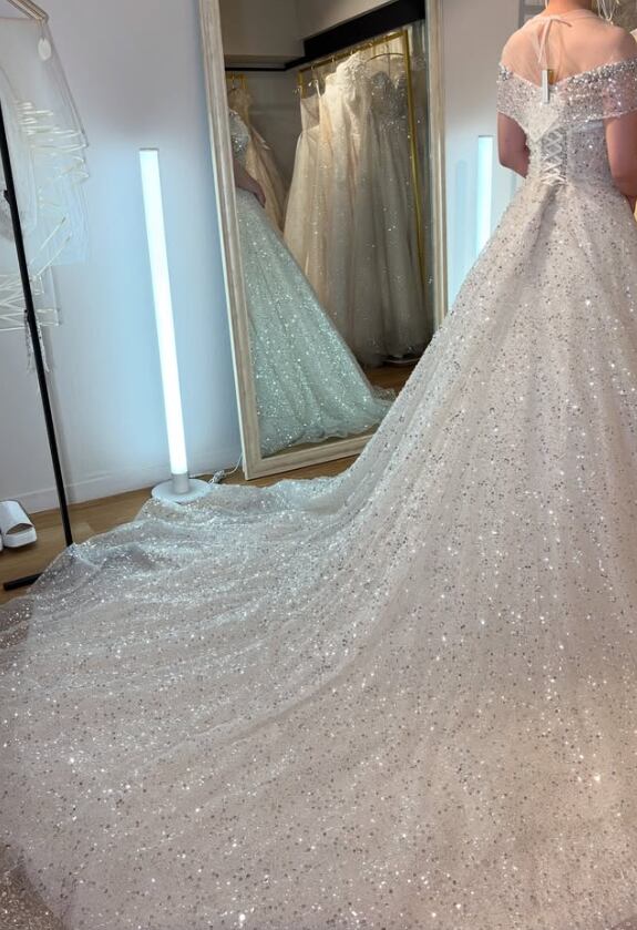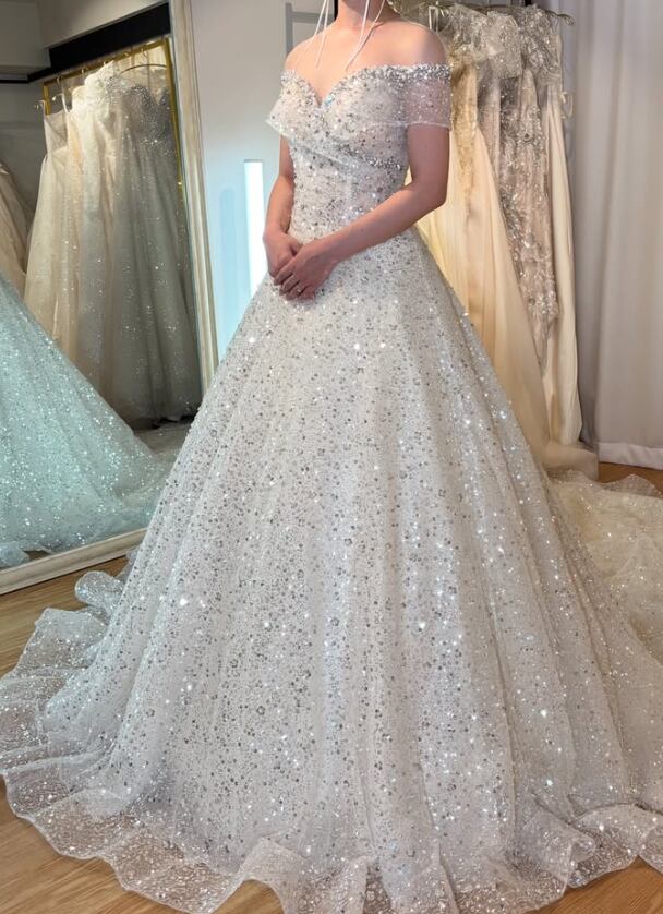 ウエディングドレス オフホワイト 韓国風ドレス オフショルダー キラキラのハンドビーディング 華やかなトレーン 結婚式