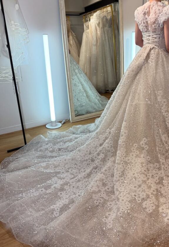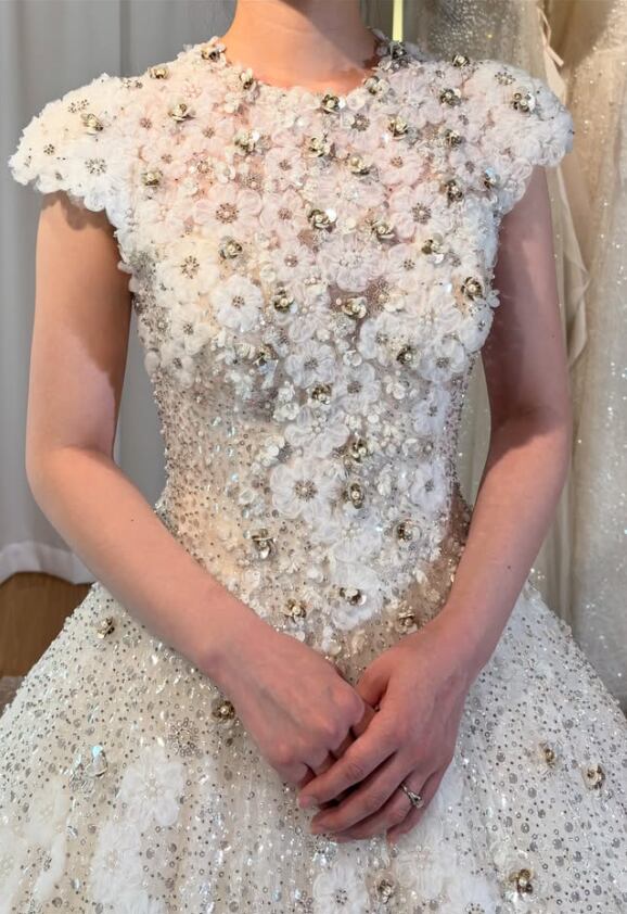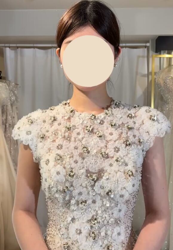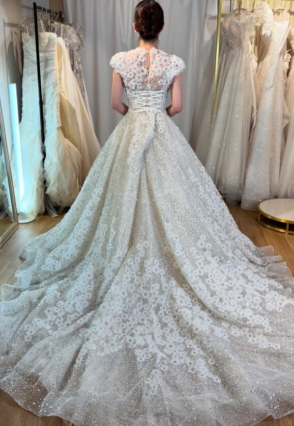 ウエディングドレス オフホワイト 韓国風ドレス 魅惑の花レース ラウンドネック 編み上げ キラキラのハンドビーディング 華やかなトレーン 結婚式 のコピー