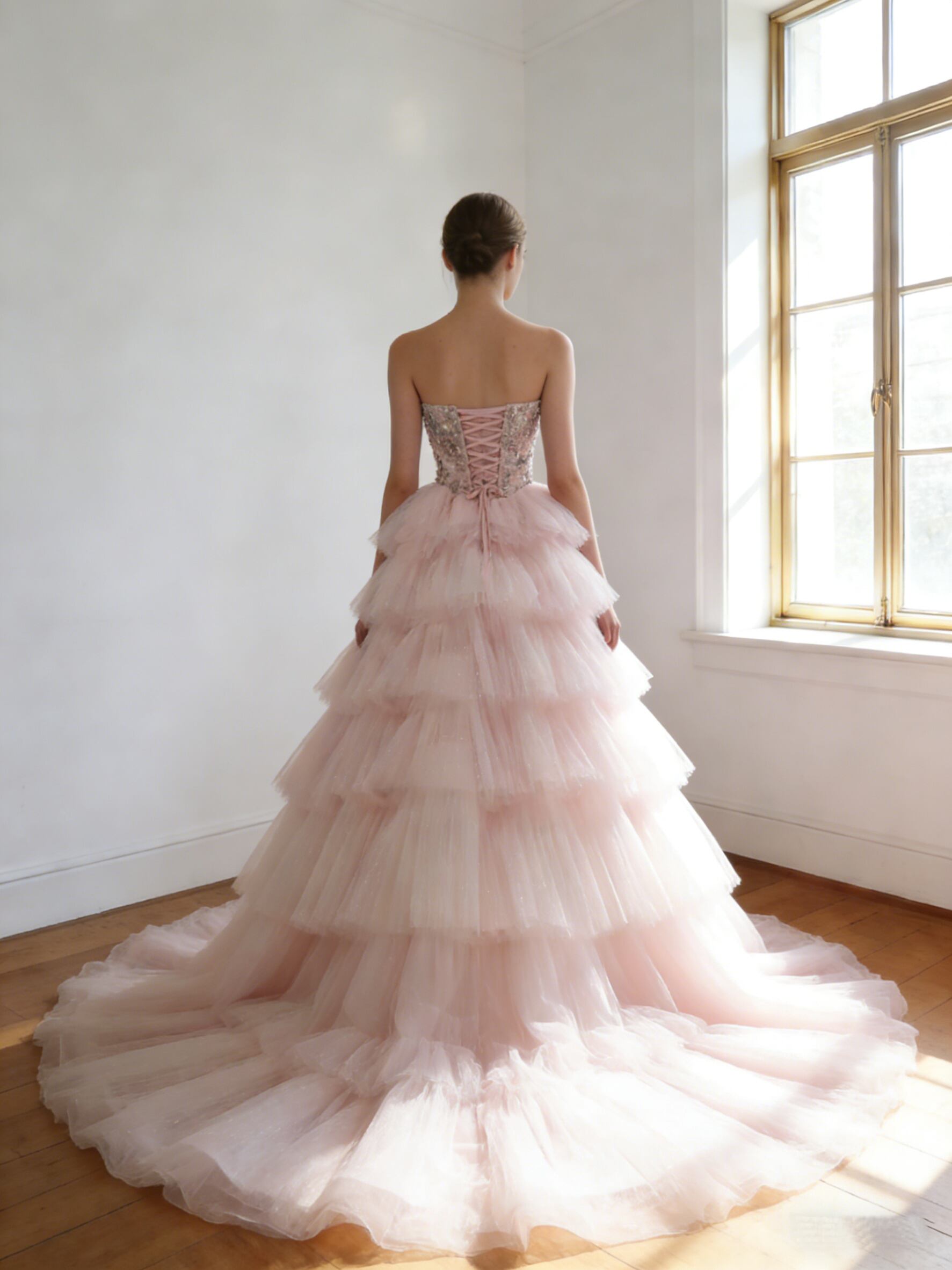 カラードレス ピンク キラキラ光る刺繍 柔らかく重ねたチュールスカート 華やかなトレーン 花嫁 前撮り