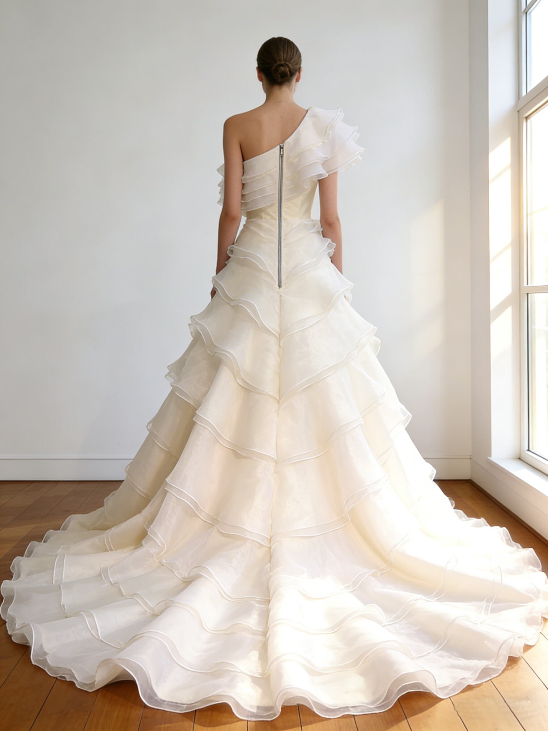ウエディングドレス オフホワイト ショルダー型 上質オーガンジー ラッフルフリル 華やかなトレーン ファスナー 結婚式