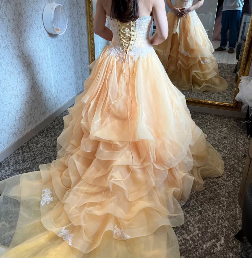 カラードレス 黄色い 繊細なレース アシンメトリー風 編み上げ 華やかなトレーン ビスチェドレス 花嫁