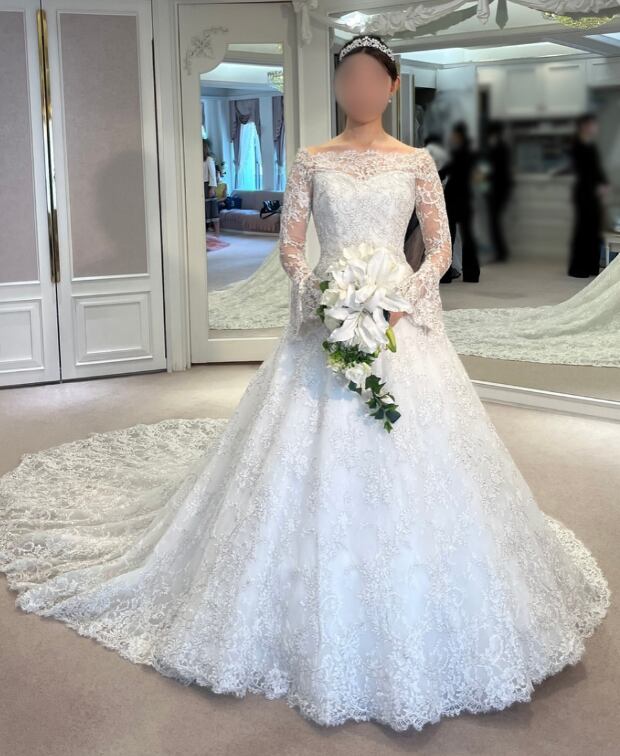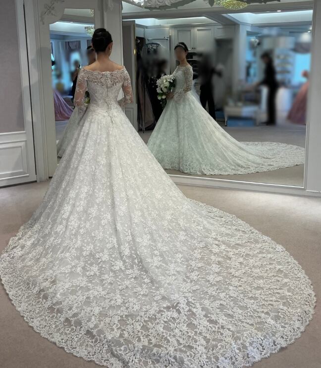 ウエディングドレス オフホワイト 韓国風ドレス ロングスリーブ 贅沢な総レース 華やかなトレーン 結婚式