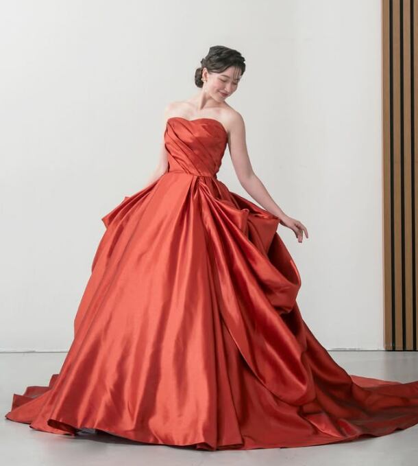 カラードレス オレンジ 光沢サテン スリット 華やかなトレーン 編み上げ 色直し アシンメトリードレス