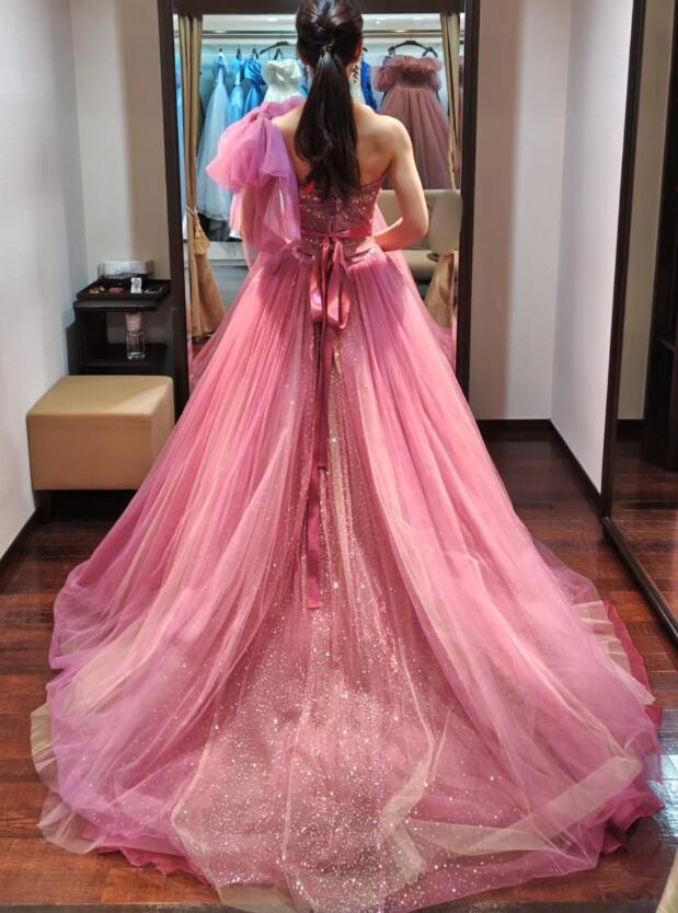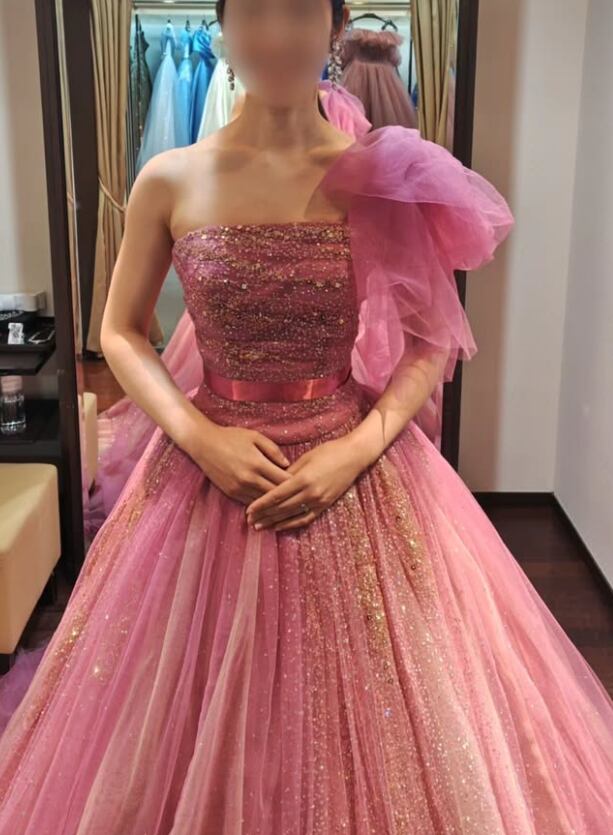 カラードレス ピンク ショルダー型 キラキラグリッターチュール サッシュベルト 華やかなトレーン 花嫁