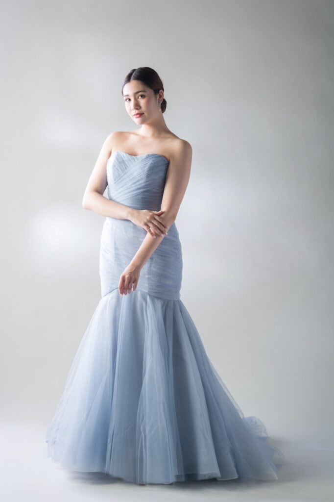 カラードレス 爽やかで優しいブルー 編み上げ ソフトチュール 細見えシルエット ソフトマーメイドライン 花嫁 前撮り