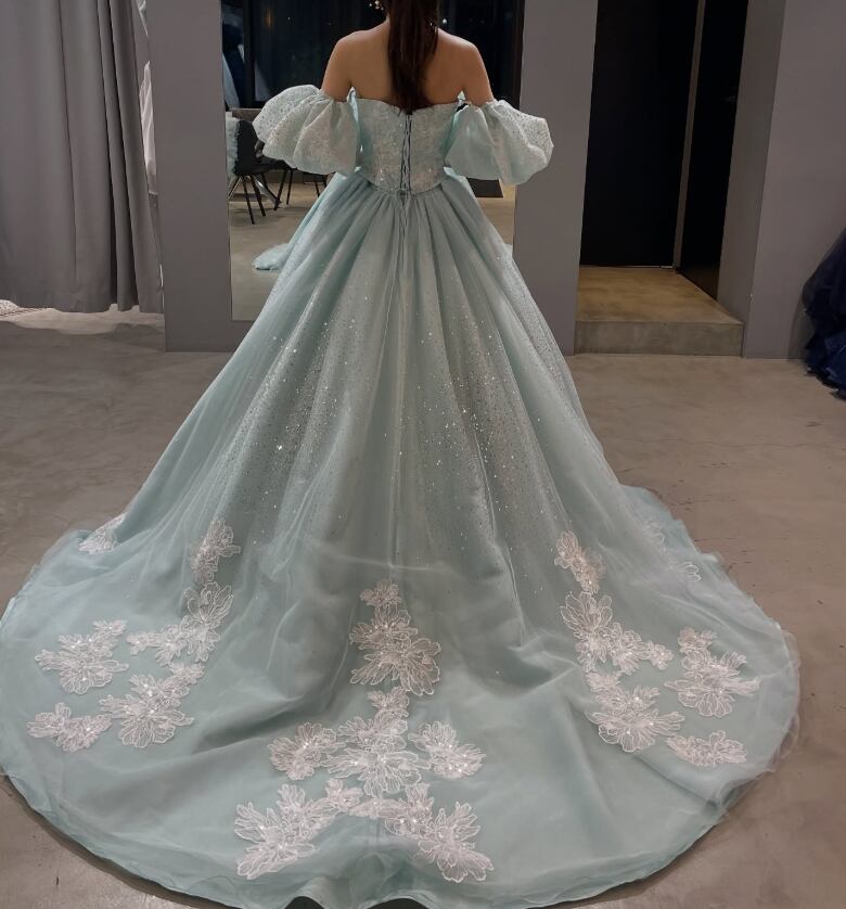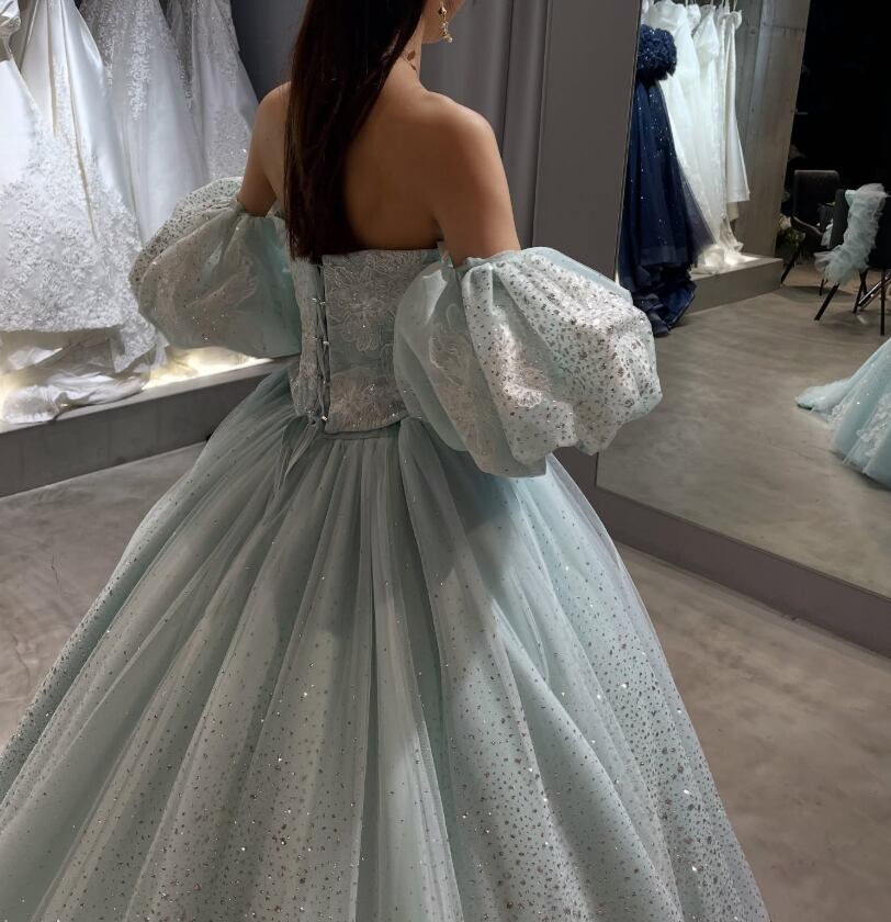 カラードレス 水色 取り外し可能な付け袖 キラキラグリッターチュール 花柄モチーフで刺繍が美しい 編み上げ 華やかなトレーン 結婚式