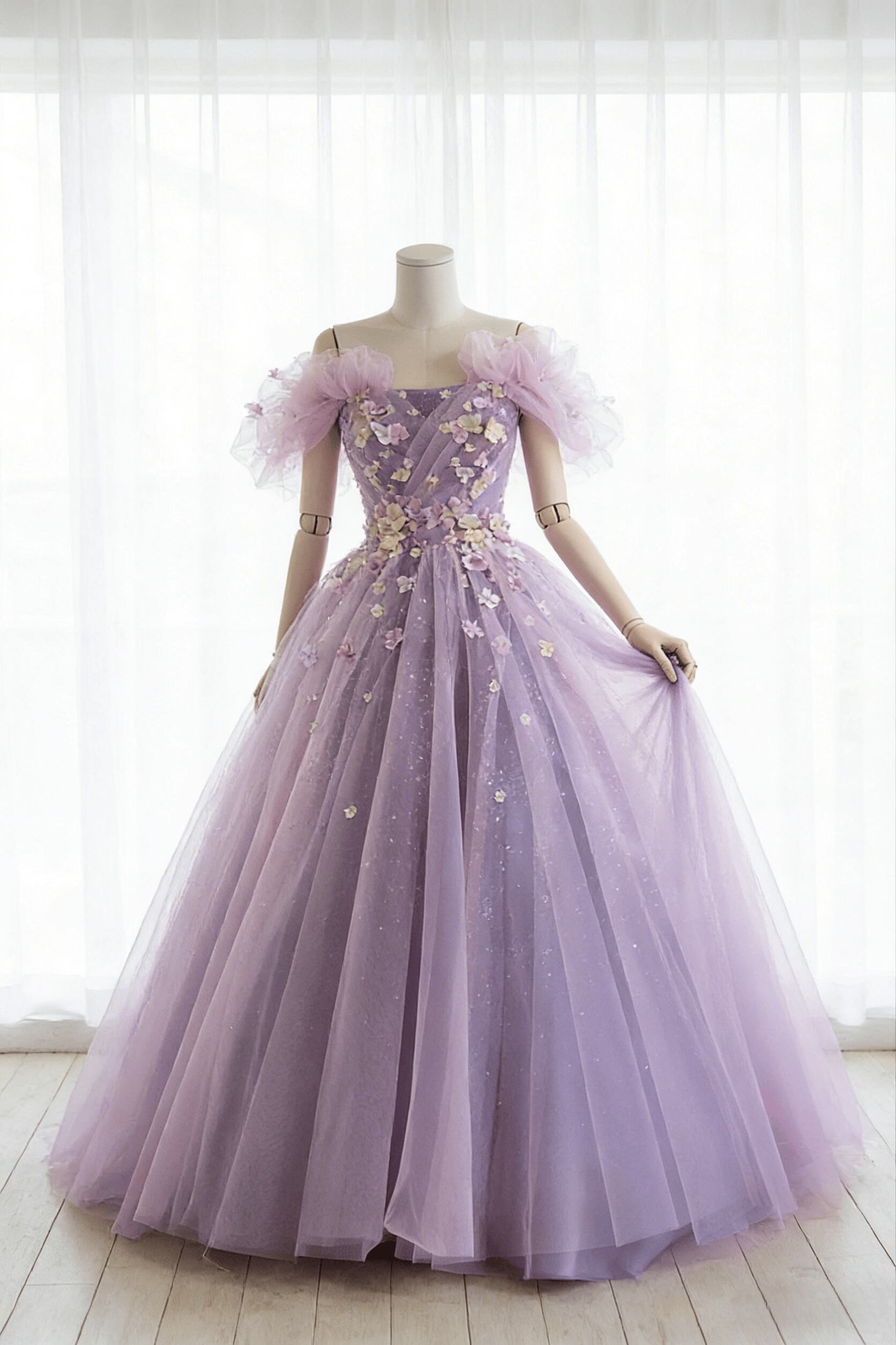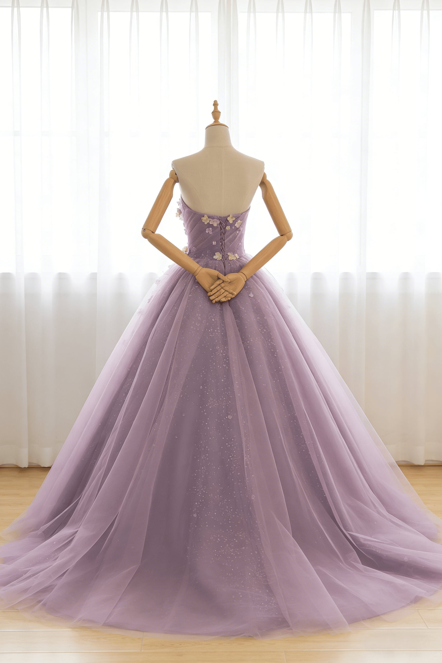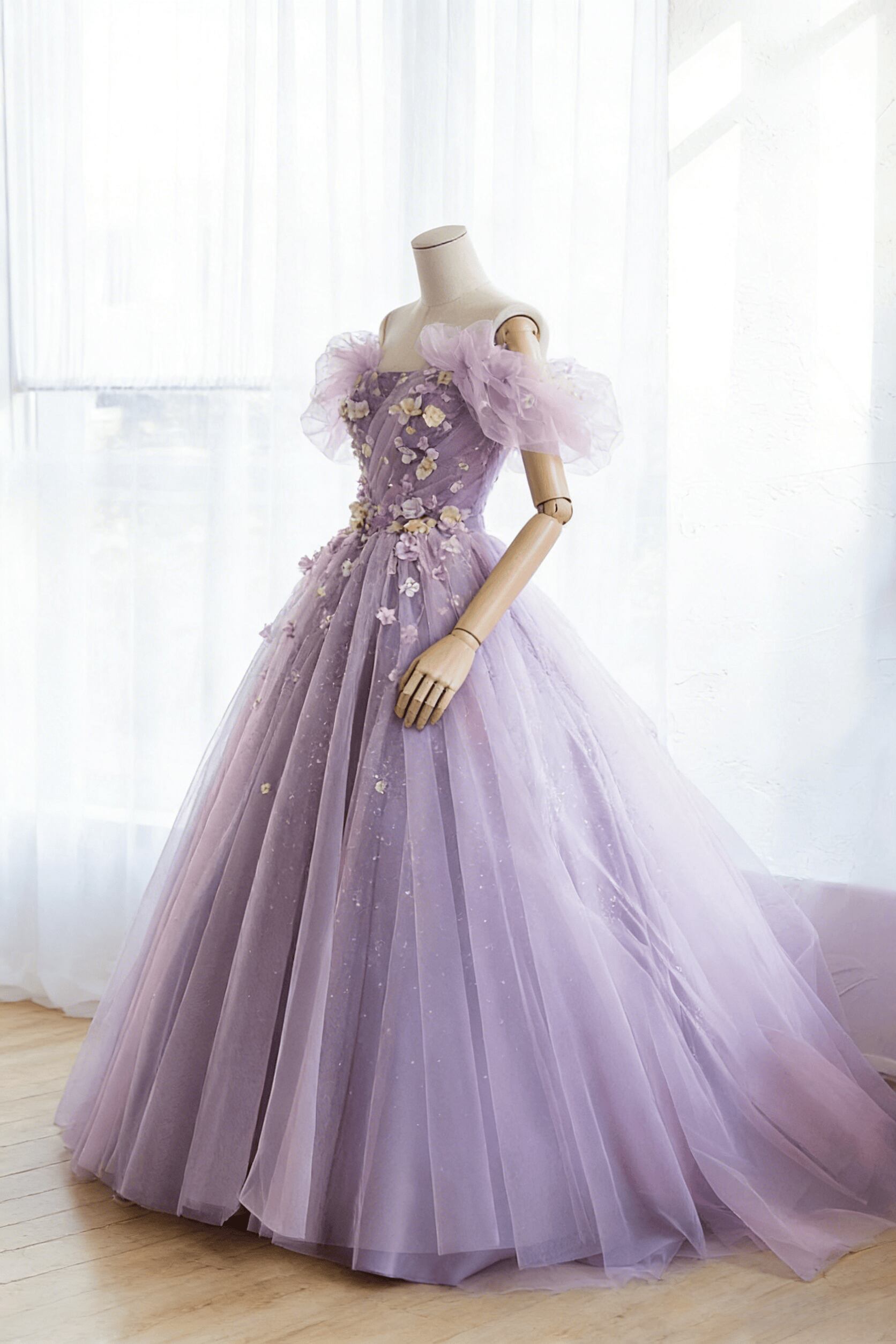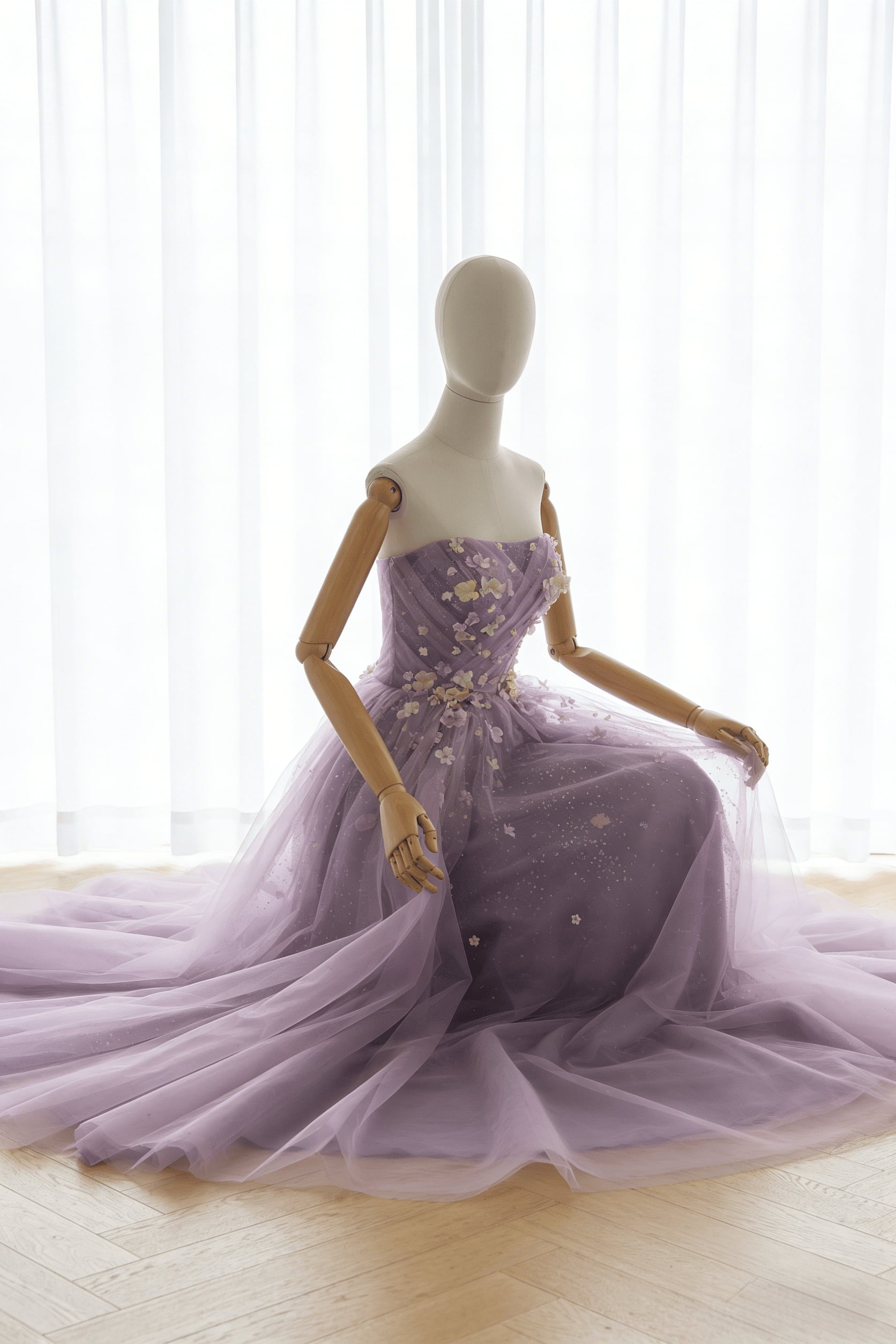 カラードレス オーキッド オフショルダー 花モチーフ シークインチュール ソフトチュール 華やかなトレーン 花嫁 前撮り