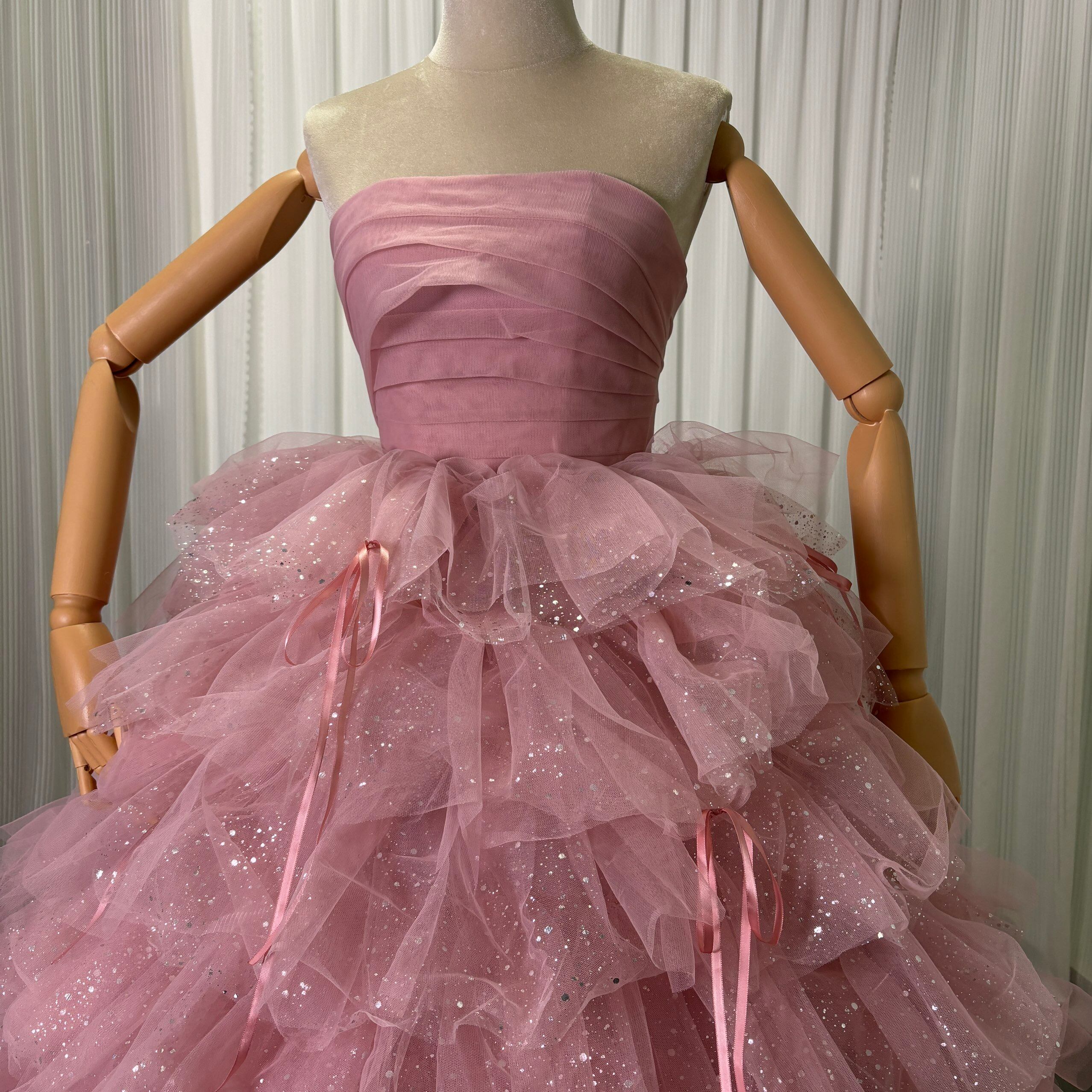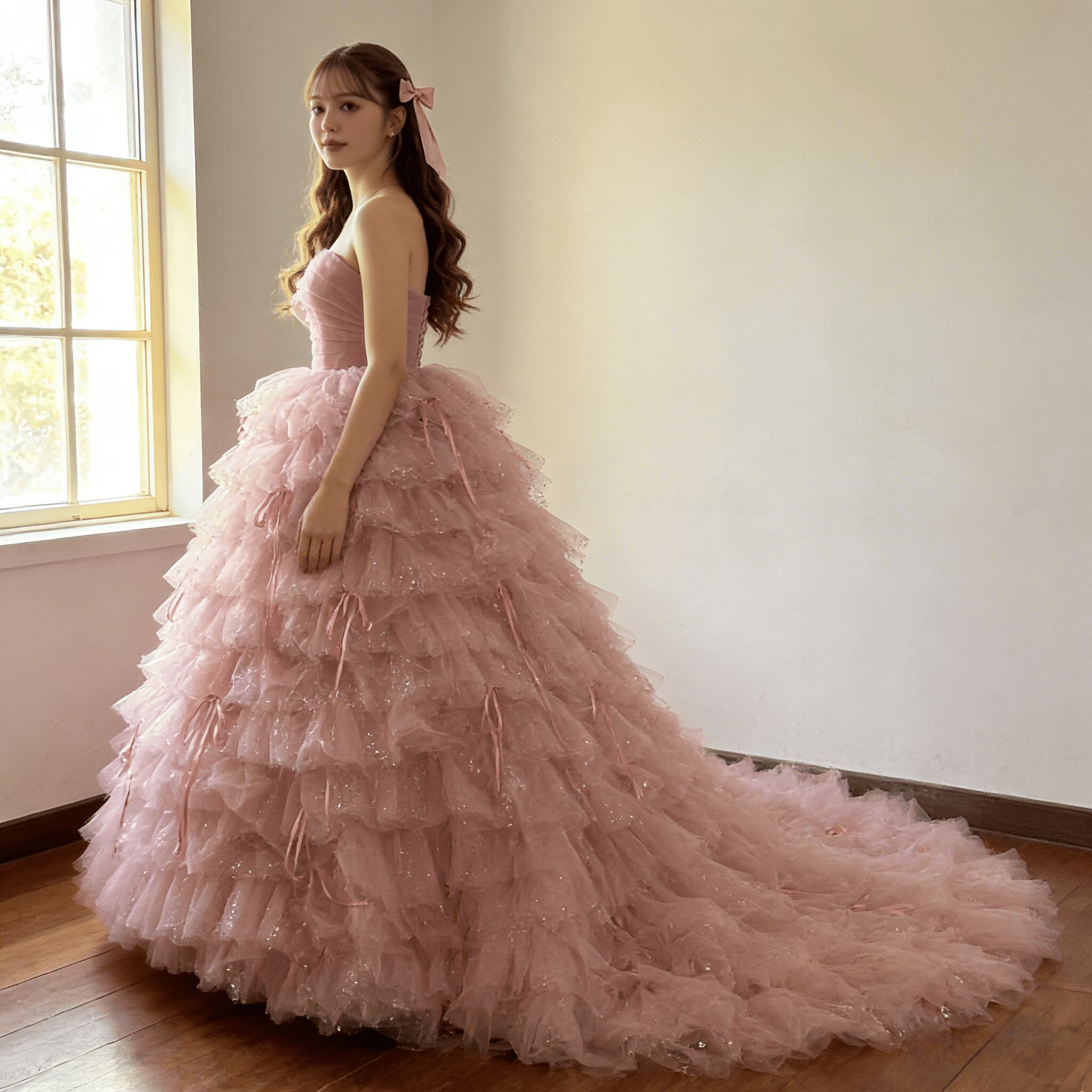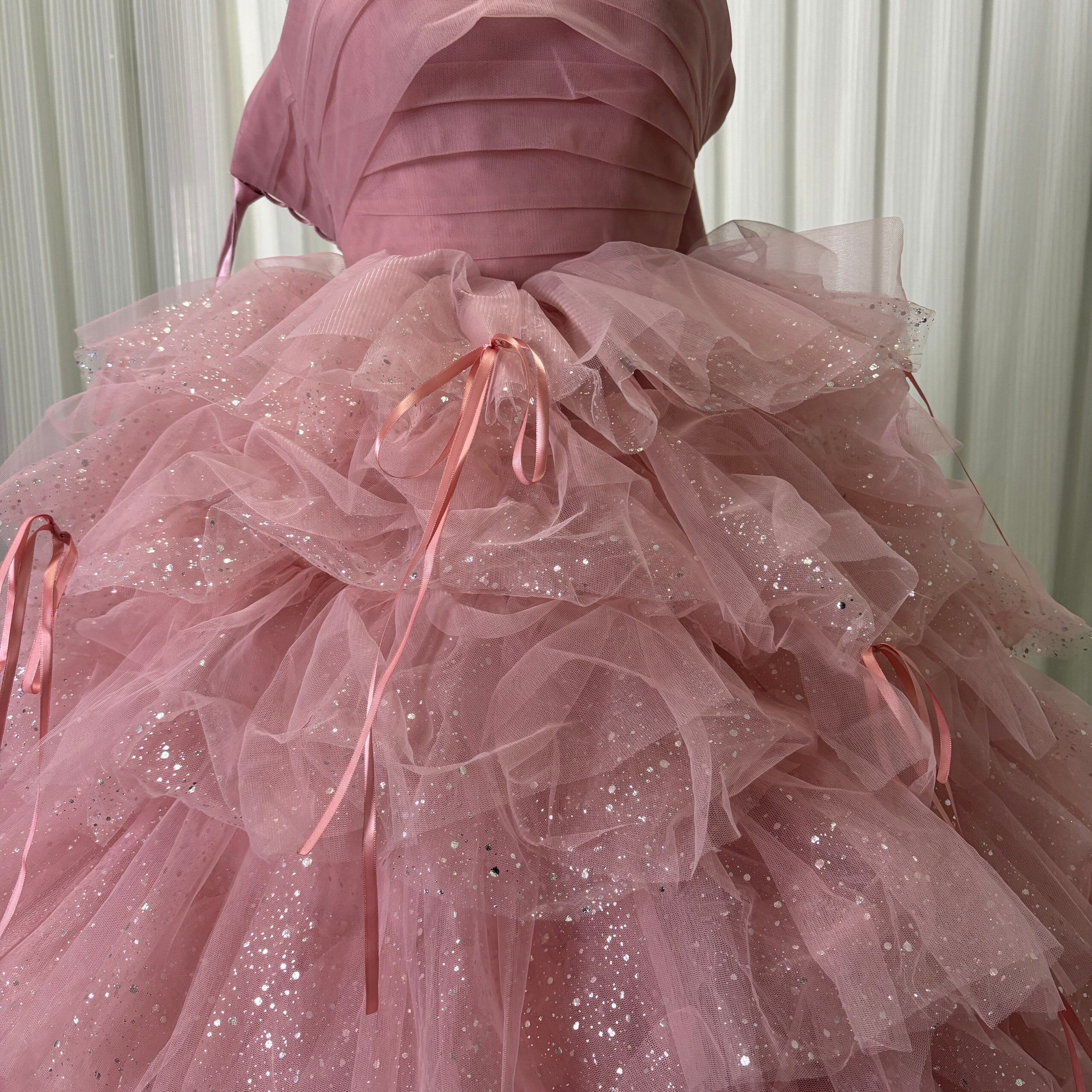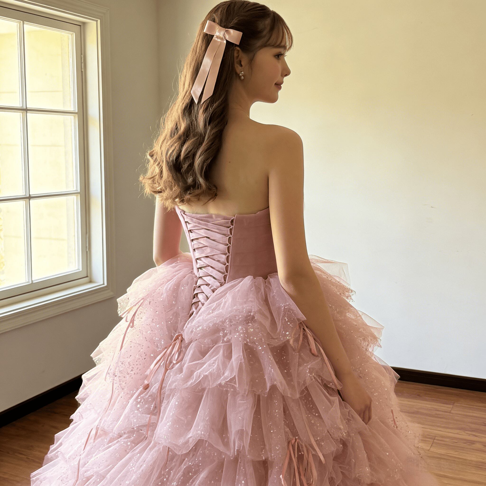 カラードレス ピンク リボン ボリュームドレス シークインチュール 編み上げ ビスチェドレス 結婚式