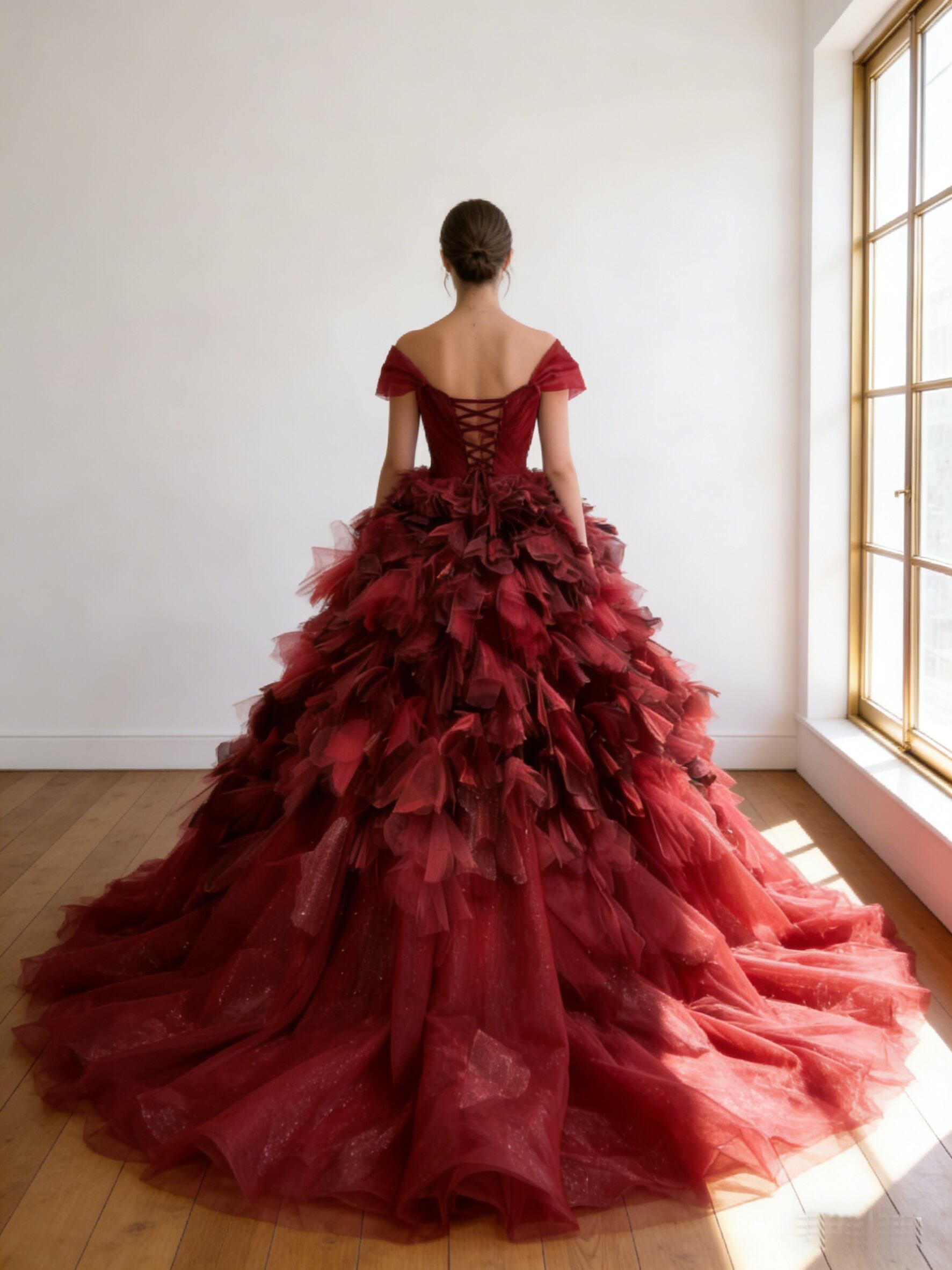 カラードレス ボルドー色 オフショルダー 柔らかく重ねたチュールスカート アシンメトリードレス 結婚式