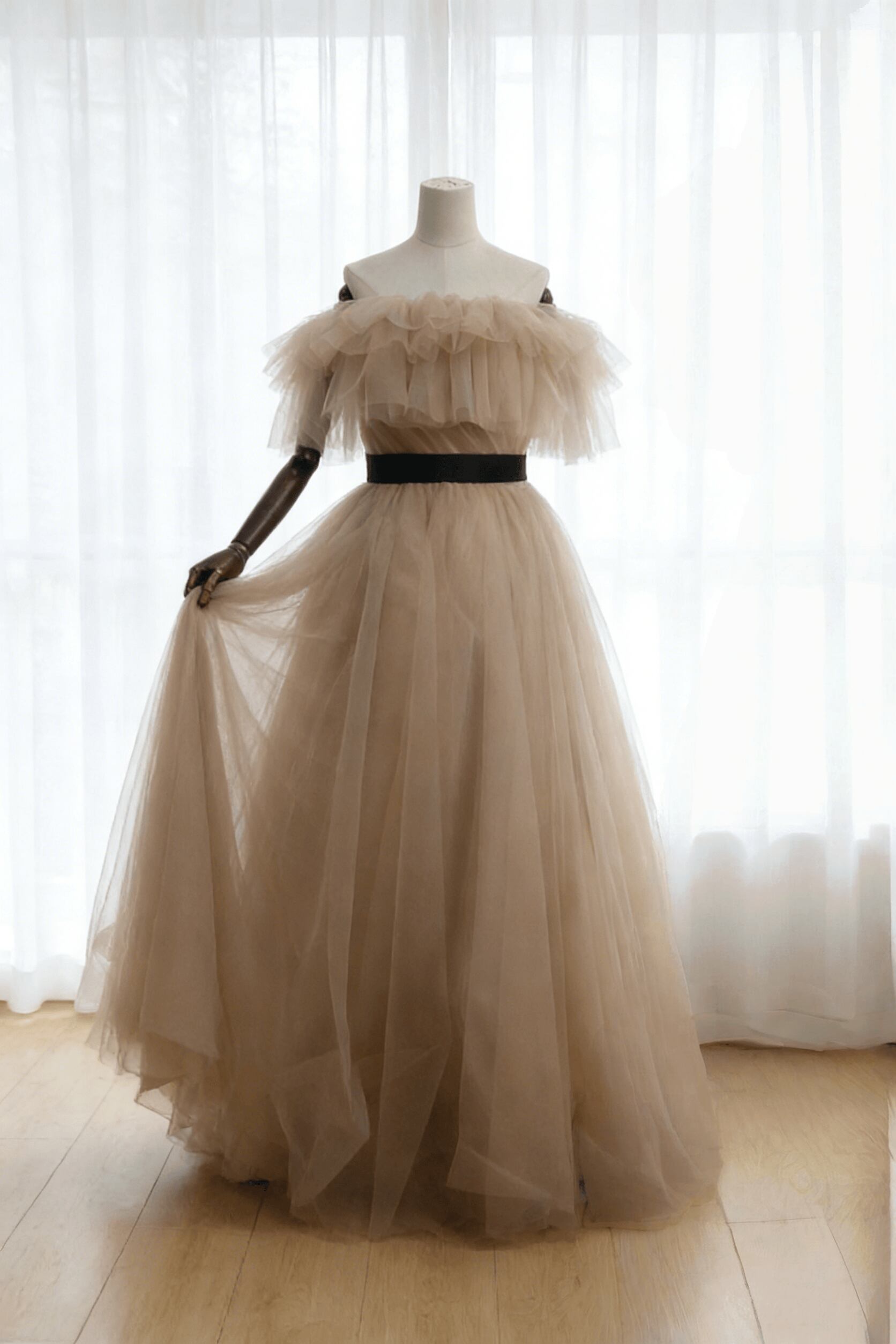 カラードレス ブラウン オフショルダー サッシュベルト 華やかなトレーン 花嫁 前撮り