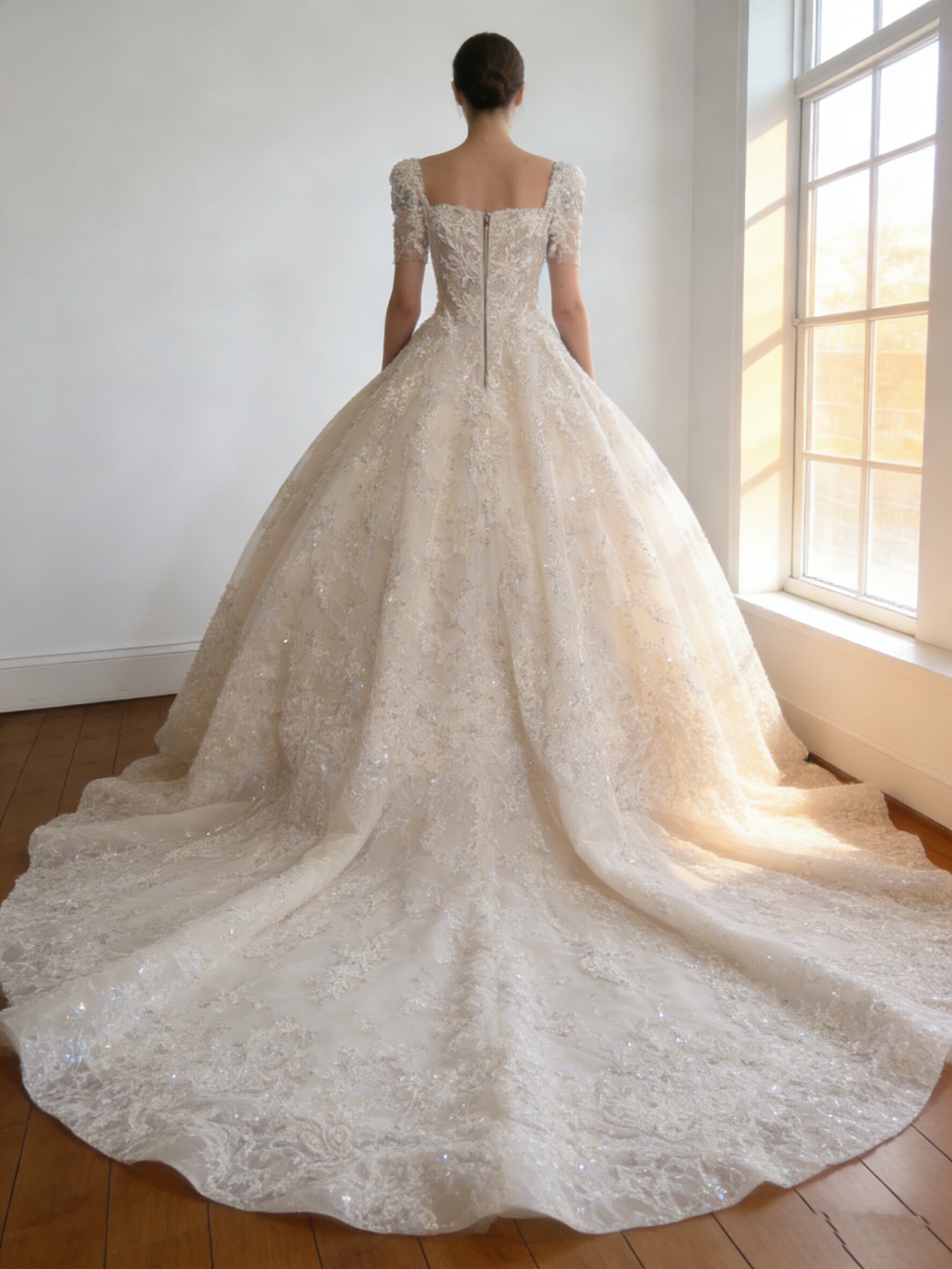 ウエディングドレス オフホワイト 韓国風ドレス 短袖 キラキラ光る刺繍 華やかなトレーン ファスナー ブライダル